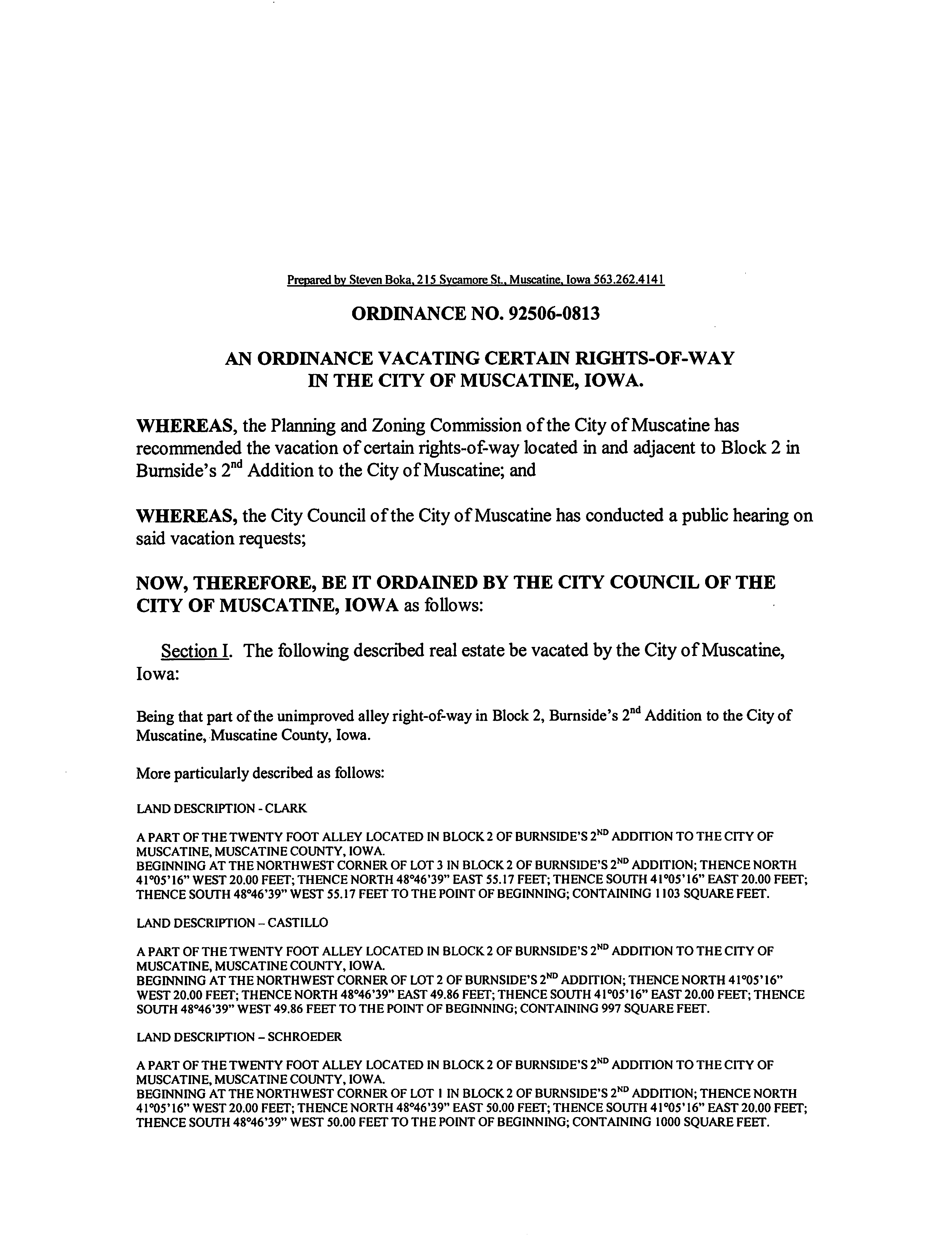 Section I. The following described real estate be vacated by the City of Muscatine,