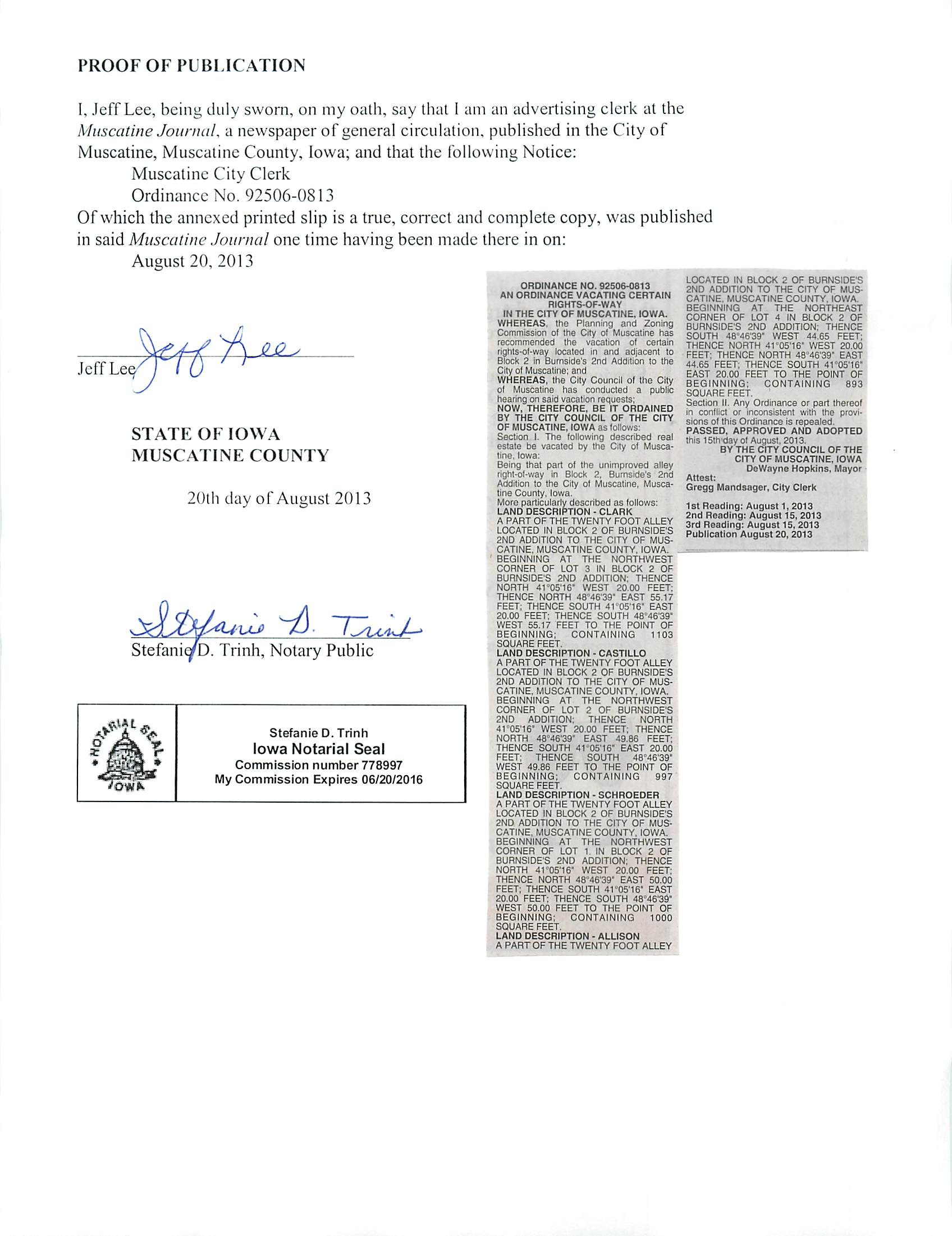 Muscatine, Muscatine County, Iowa; and that the following Notice: