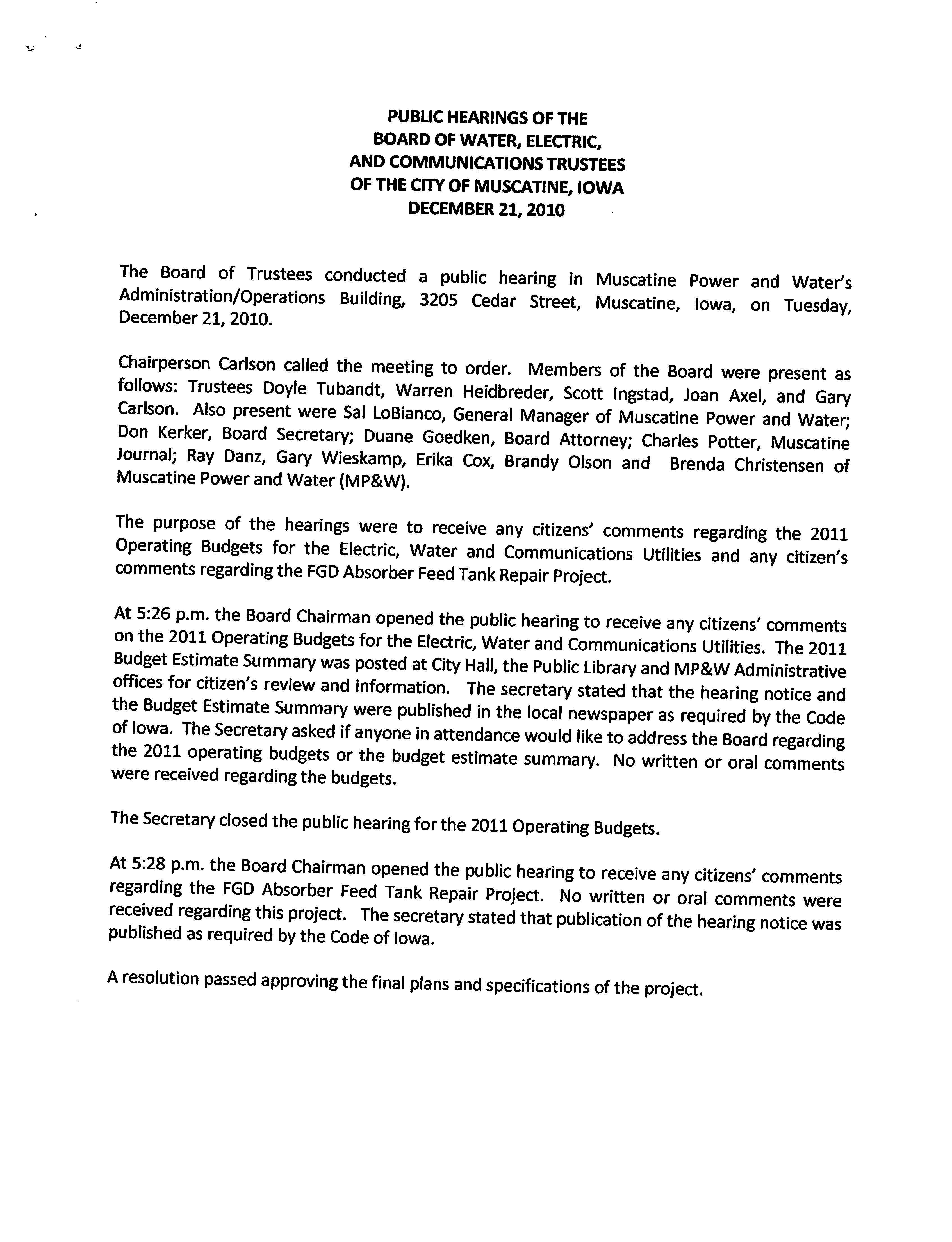 The Board of Trustees conducted a public hearing in Muscatine Power and Water's