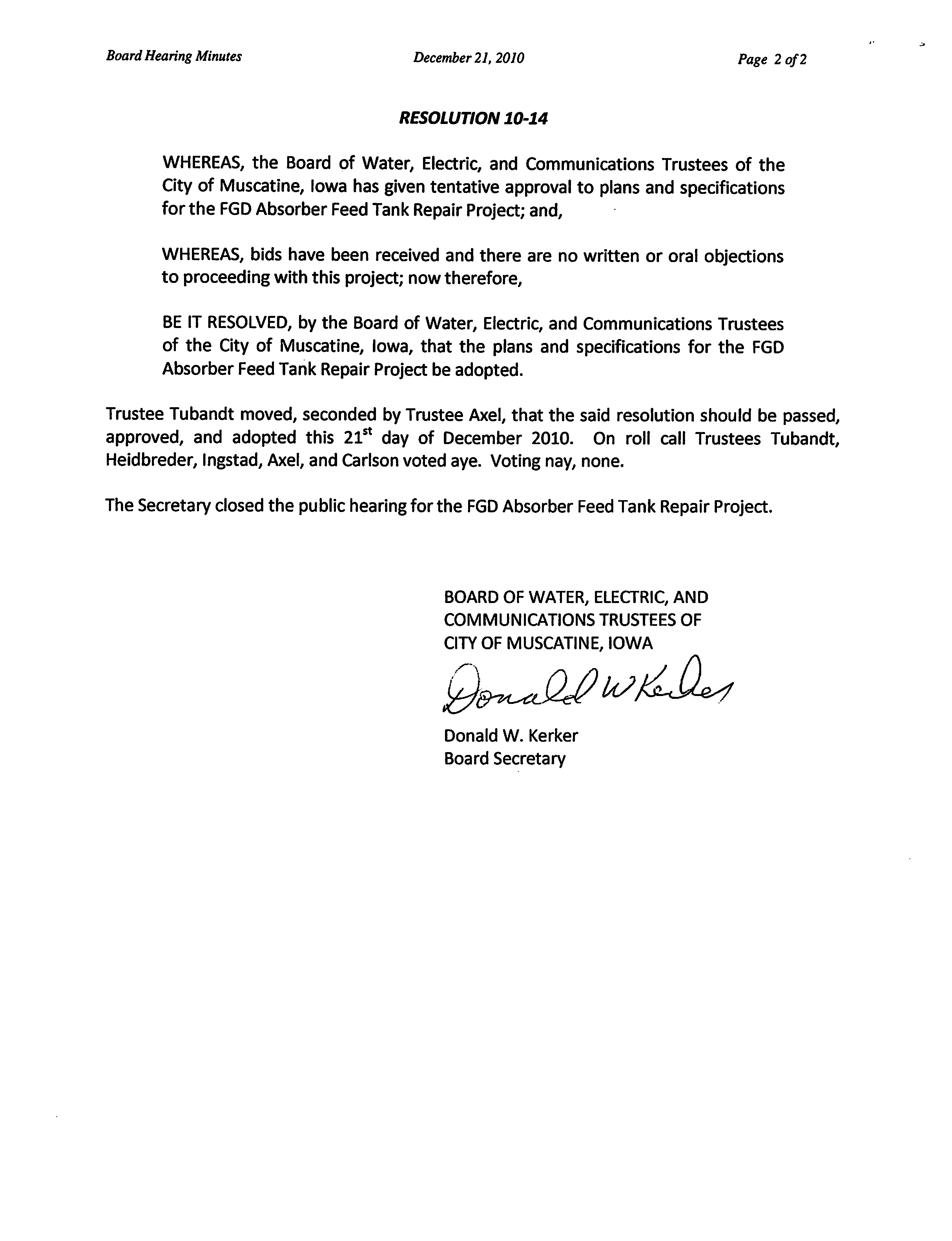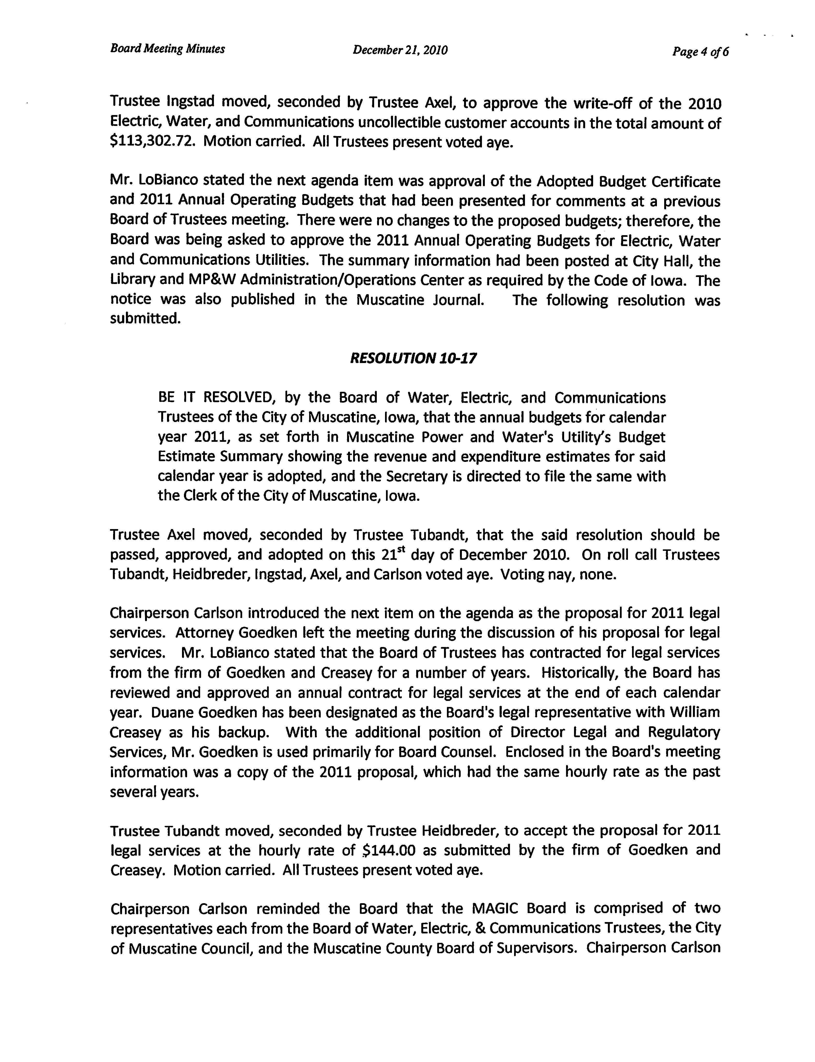 approved, and adopted this 21st day of December 2010. On roll call Trustees Tubandt,