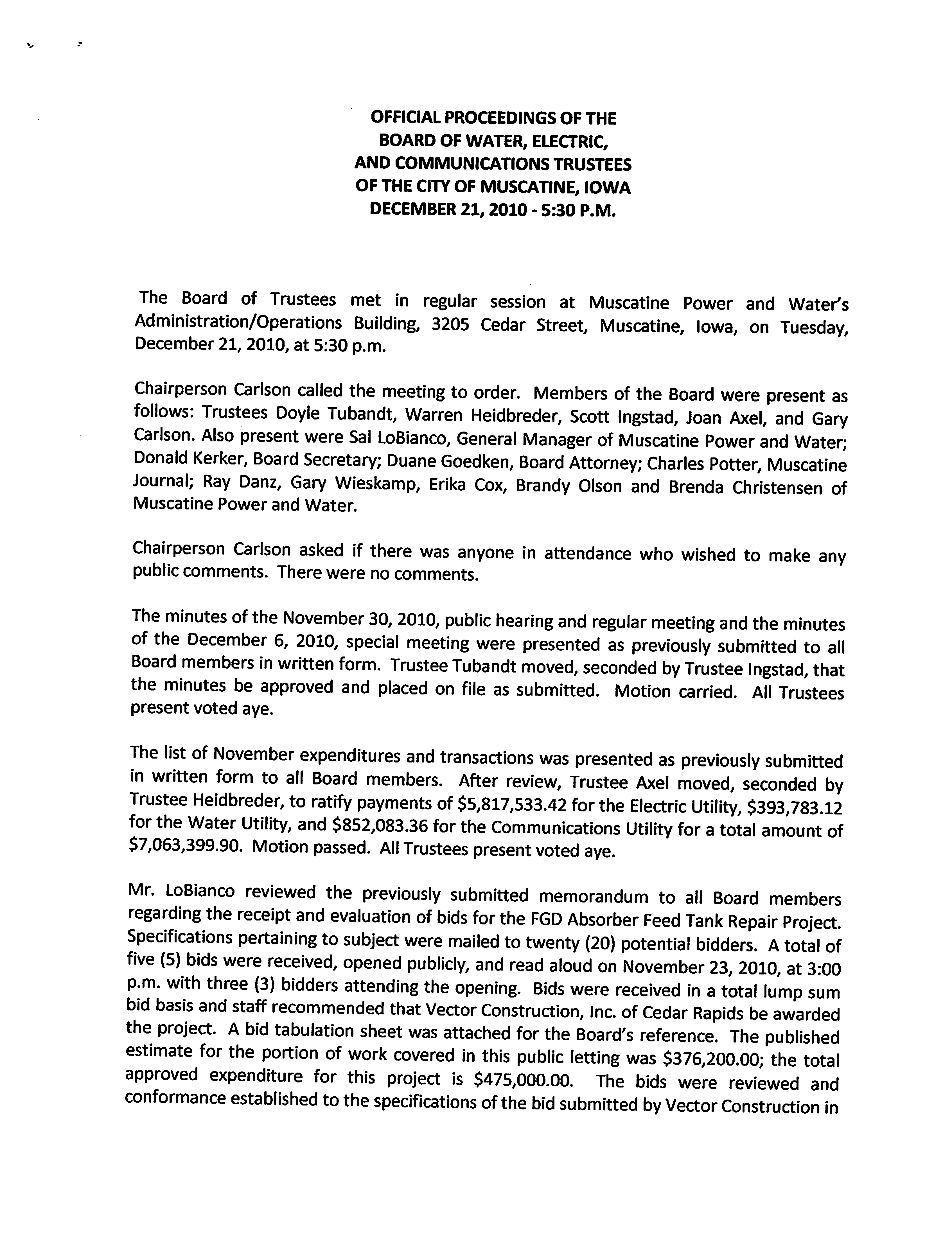 Carlson. Also present were Sal LoBianco, General Manager of Muscatine Power and Water;