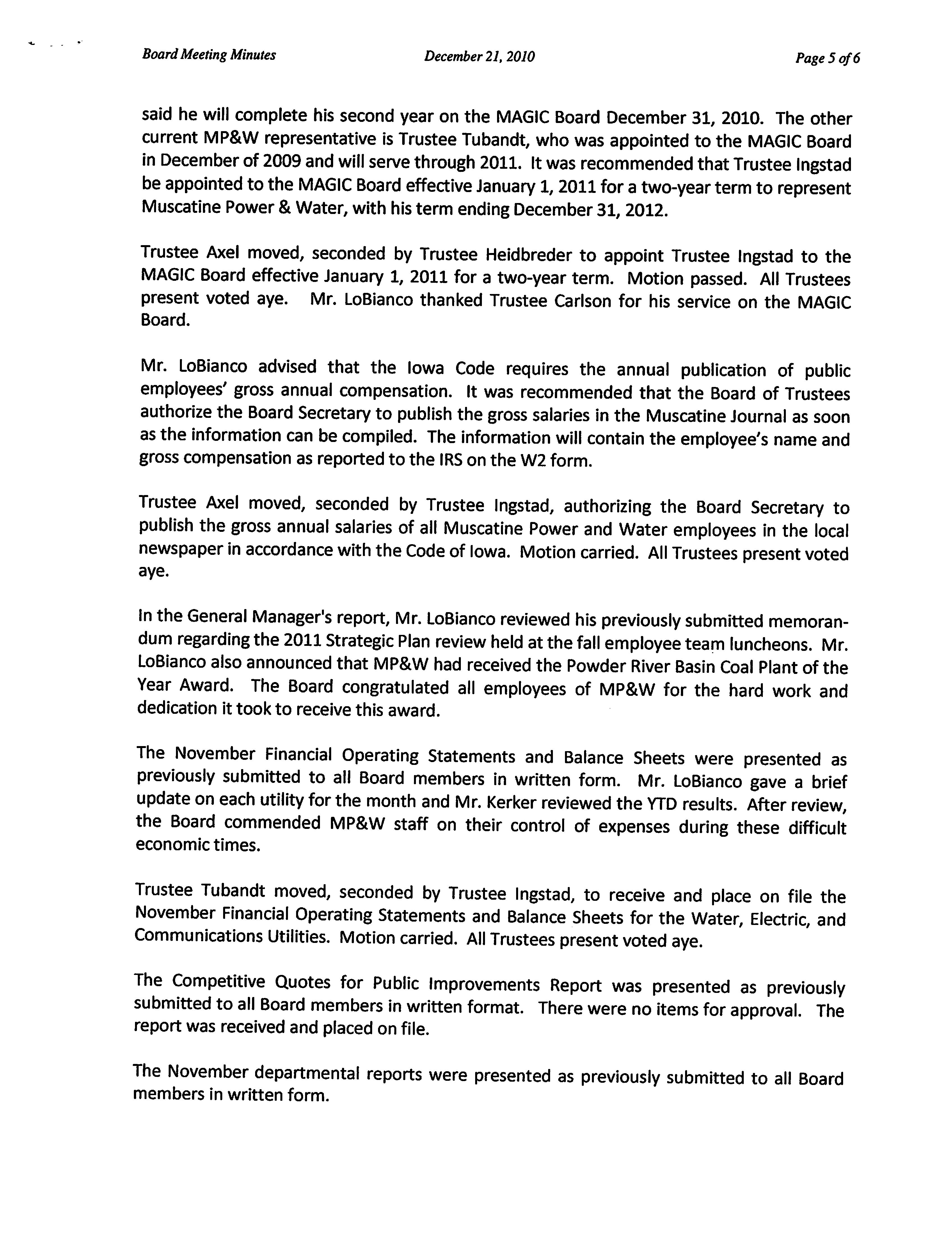 MAGIC Board effective January 1, 2011 for a two-year term. Motion passed. All Trustees