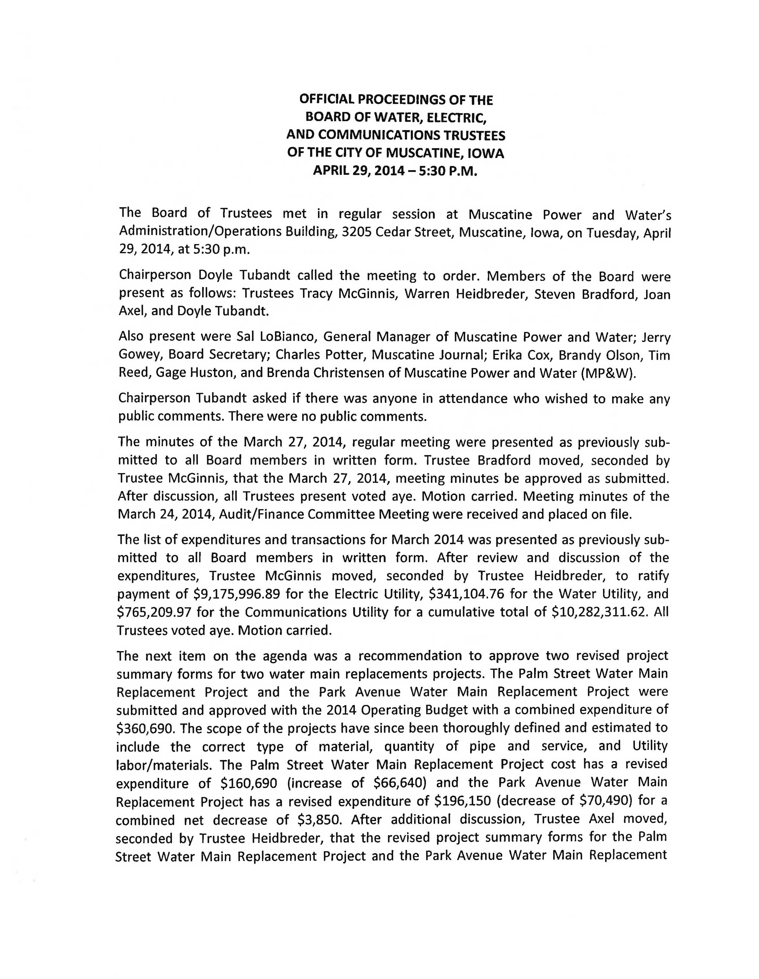The minutes of the March 27, 2014, regular meeting were presented as previously sub-