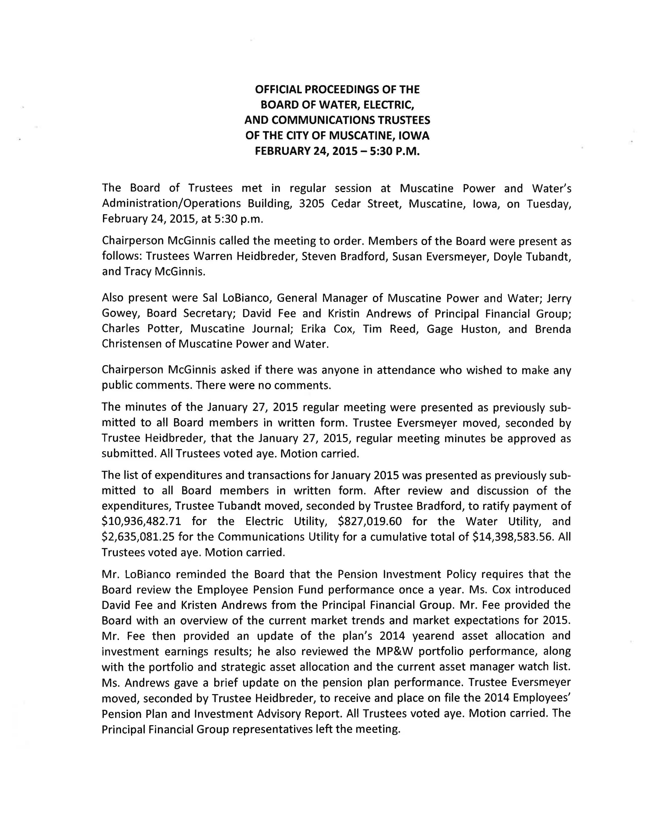 The Board of Trustees met in regular session at Muscatine Power and Water's