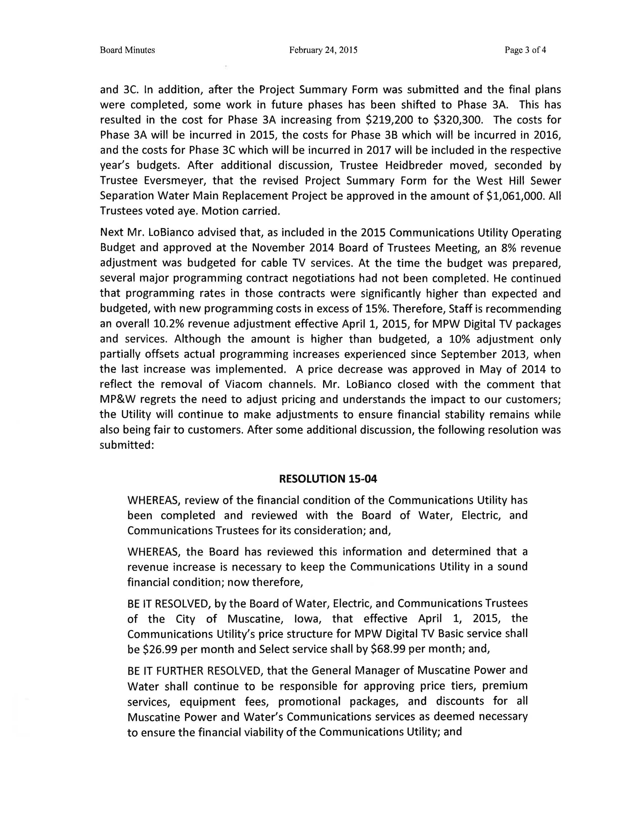 BE IT RESOLVED, by the Board of Water, Electric, and Communications Trustees