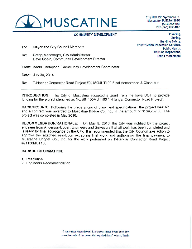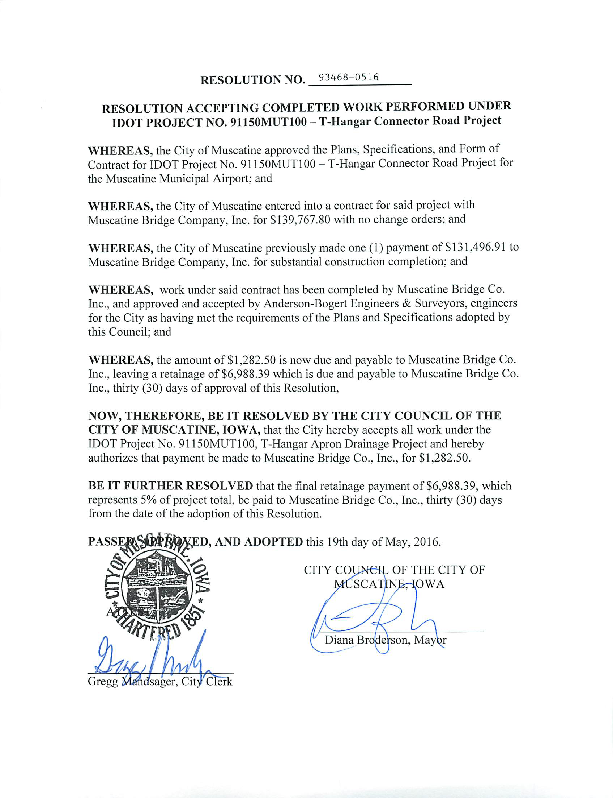 Version 1 Res. Adopted Accepting Completed Work for the Airport T-Hangar Connector Road Project and Authorizing Final Payment to Muscatine Bridge Company