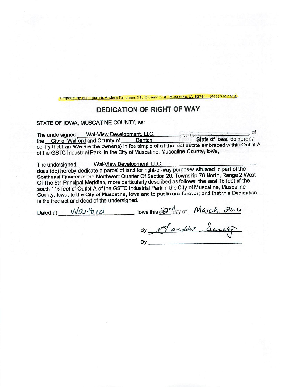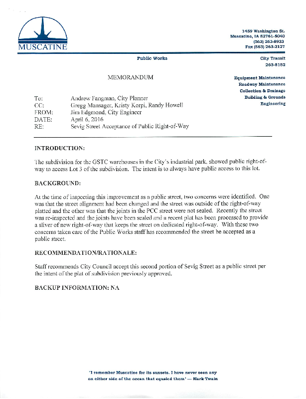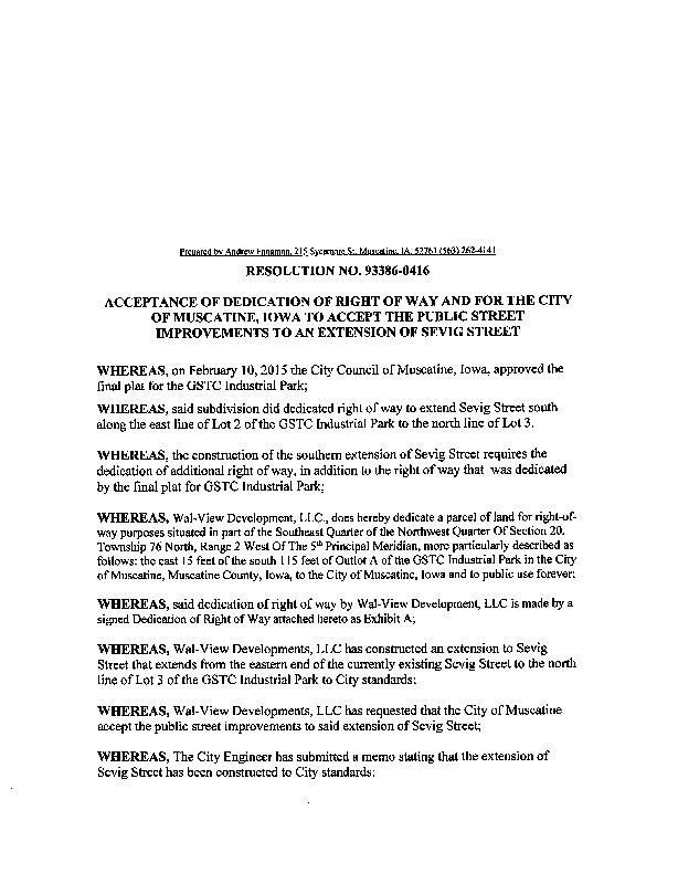 Version 1 Res. Adopted Accepting Dedication of Right-of-Way for the City to Accept the Public Street Improvements to an Extension of Sevig Street
