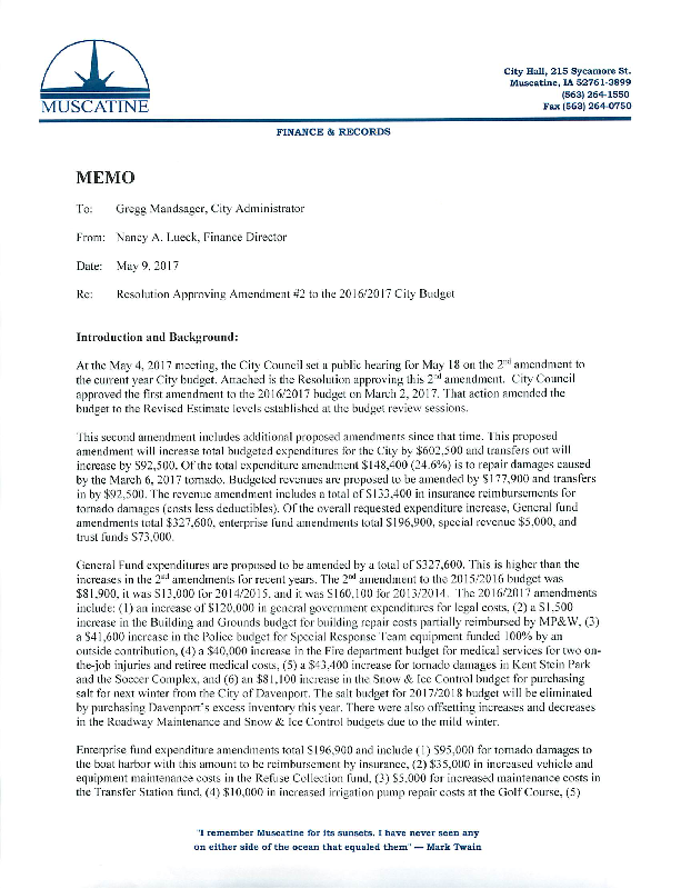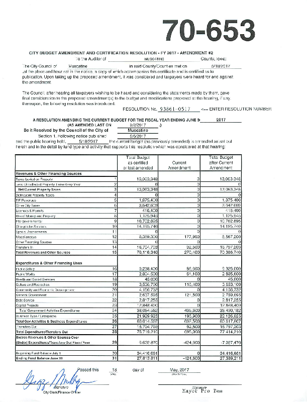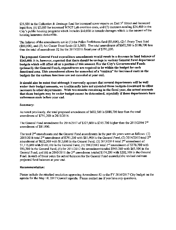 Version 1 Res. Adopted Approving Amendment #2 to the Fiscal Year 2016/2017 City Budget