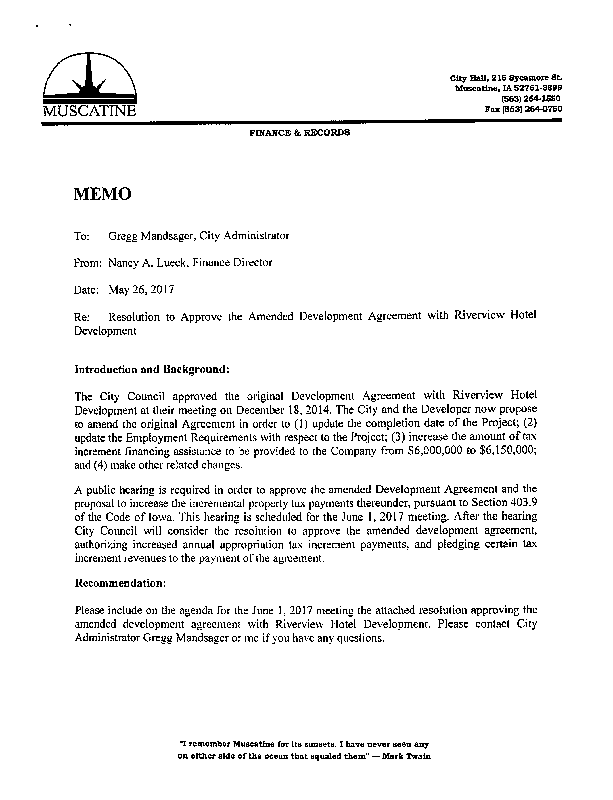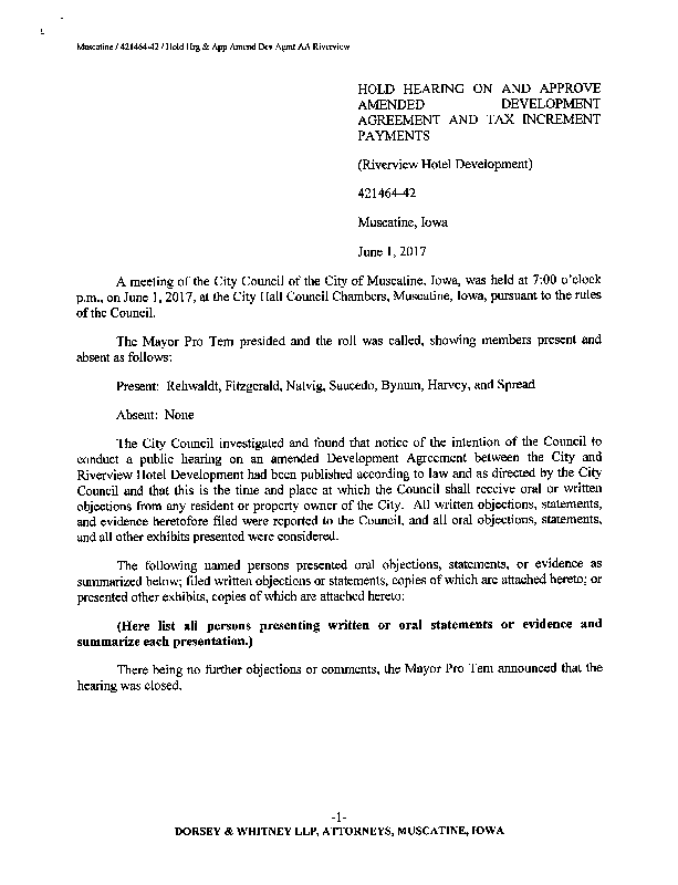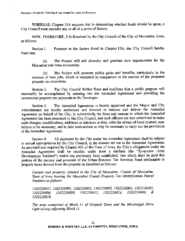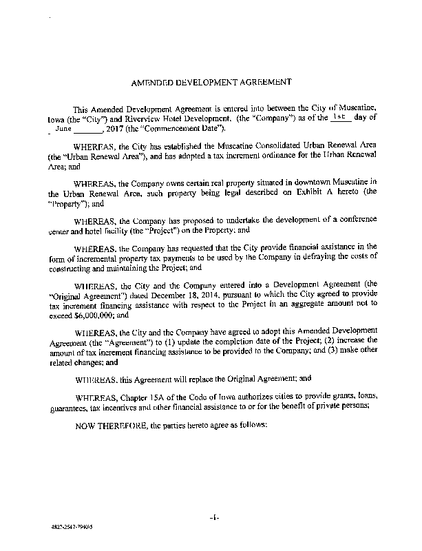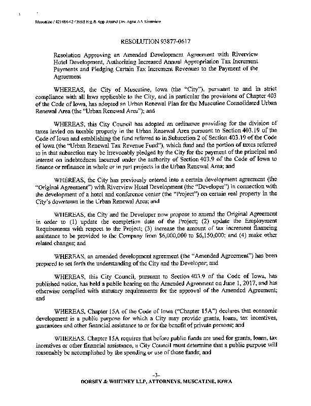 Version 1 Res. Adopted Approving Amended Development Agreement with Riverview Hotel Development and Authorizing Increased Annual Appropriation Tax Increment Payments and Pledging Certain Tax Increments to Payment of the Agreement