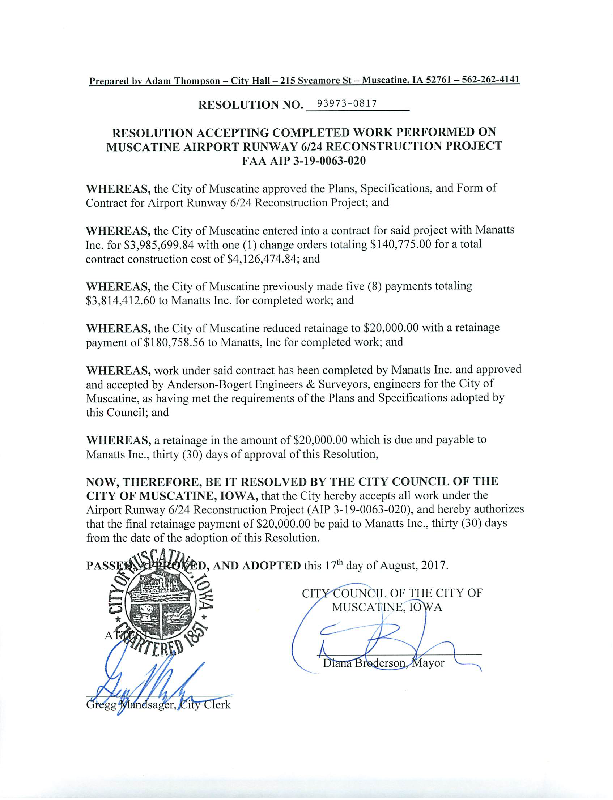 Version 1 Res. Adopted Accepting Completed Work Performed Under the Airport Runway 6/24 Reconstruction Project and Authorizing Final Payment to Manatts Inc.