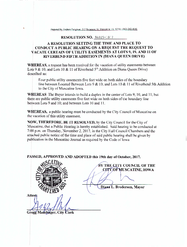 Version 1 94025-1017 Res. Adopted Approving the Setting of a Public Hearing on Request to Vacate Utility Easements at Lots 9, 11 and 19 of Riverbend Fifth Edition.pdf
