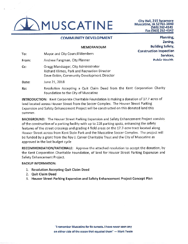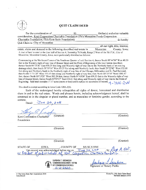 Version 1 RESOLUTION ACCEPTING A QUIT CLAIM DEED FROM THE KENT CORPORATION CHARITABLE FOUNDATION TO THE CITY OF MUSCATINE, IOWA