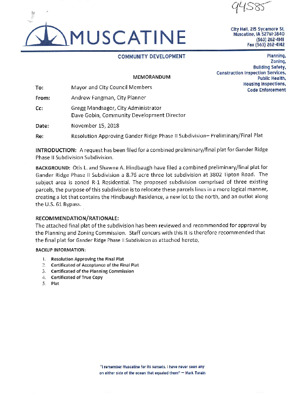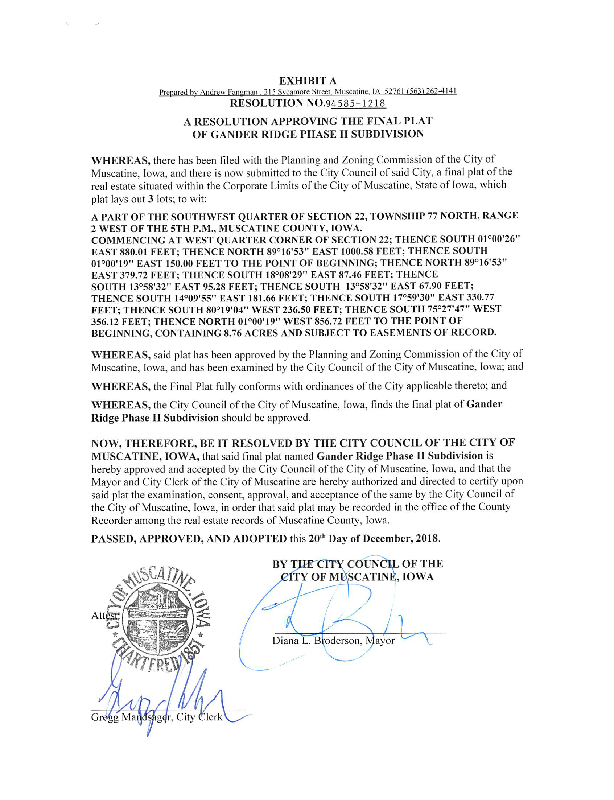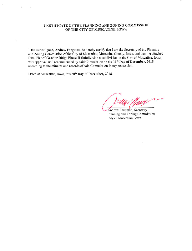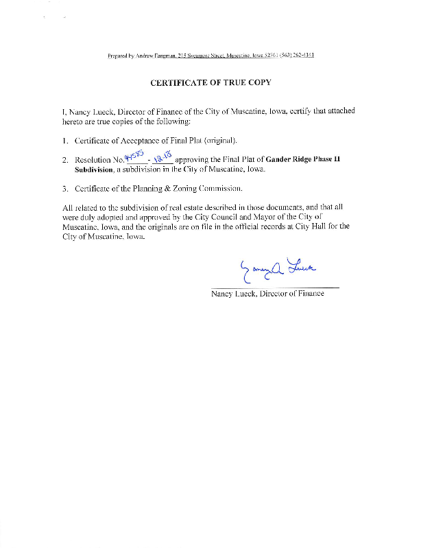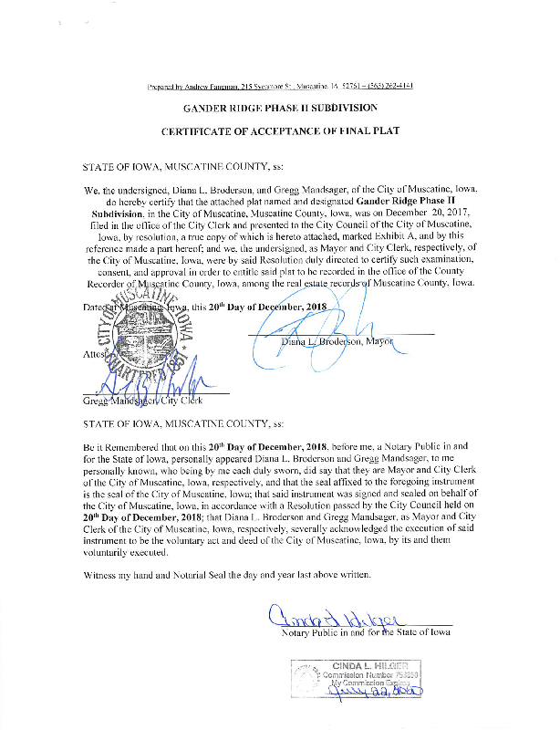 Version 1 GANDER RIDGE PHASE II SUBDIVISION CERTIFICATE OF ACCEPTANCE OF FINAL PLAT