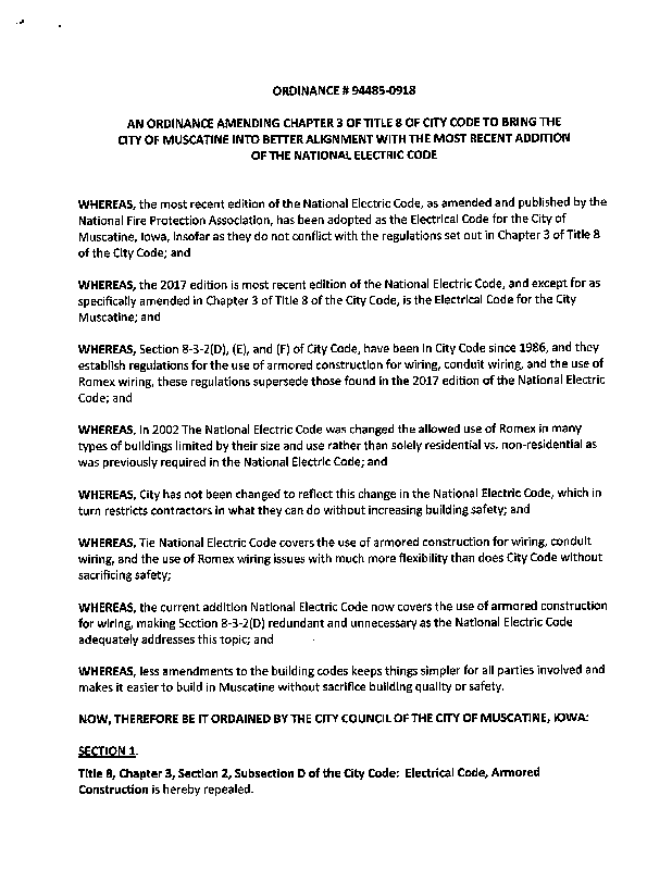 Version 1 ORDINANCE AMENDING CHAPTER 3 OF TITLE 8 OF CITY CODE TO BRING THE CITY OF MUSCATINE INTO BETTER ALIGNMENT WITH THE MOST RECENT ADDITION OF THE NATIONAL ELECTRIC CODE