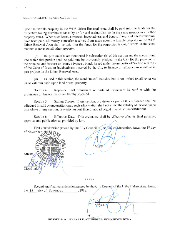 Version 1 Ordinance Providing for the Division of Taxes Levied on Taxable Property in the November, 2018 Consolidated Muscatine Urban Renewal Area Addition, Pursuant to Section 403.19 of the Code of Iowa (Amendment to the WDS Urban Renewal Area)