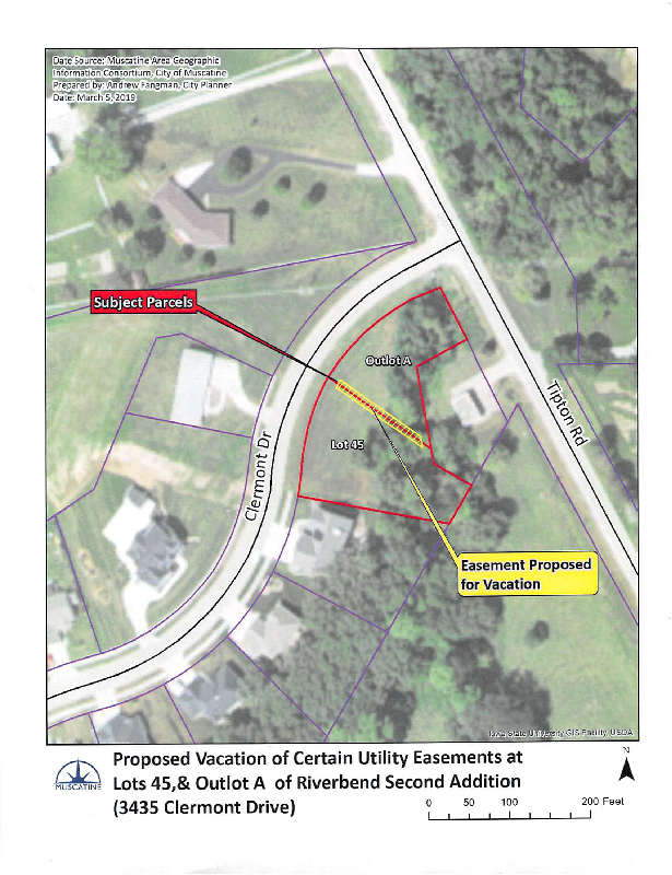 Version 1 RESOLUTION SETTING THE TIME AND PLACE TO CONDUCT A PUBLIC HEARING ON A REQUEST THE REQUEST TO VACATE CERTAIN OF UTILITY EASEMENTS AT LOT 45 AND OUTLOT A OF RIVERBEND SECOND ADDITION (3435 CLERMONT DRIVE)