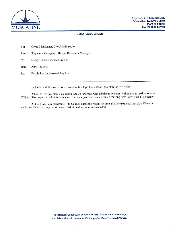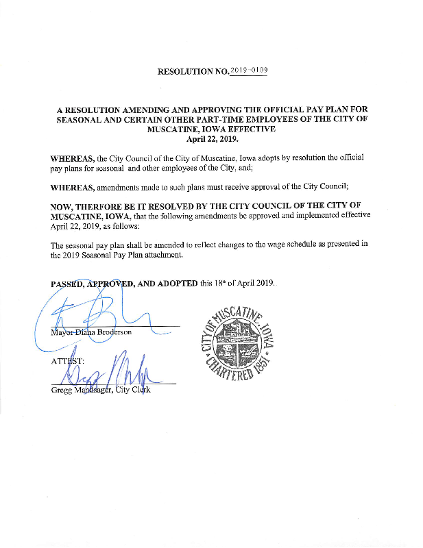 Version 1 RESOLUTION AMENDING AND APPROVING THE OFFICIAL PAY PLAN FOR SEASONAL AND CERTAIN OTHER PART-TIME EMPLOYEES OF THE CITY OF MUSCATINE, IOWA EFFECTIVE April 22, 2019.