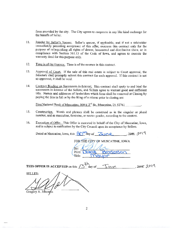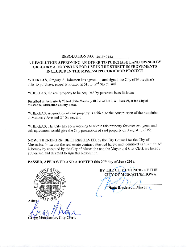 Version 1 RESOLUTION APPROVING AN OFFER TO PURCHASE LAND OWNED BY GREGORY A. JOHNSTON FOR USE IN THE STREET IMPROVEMENTS INCLUDED IN THE MISSISSIPPI CORRIDOR PROJECT