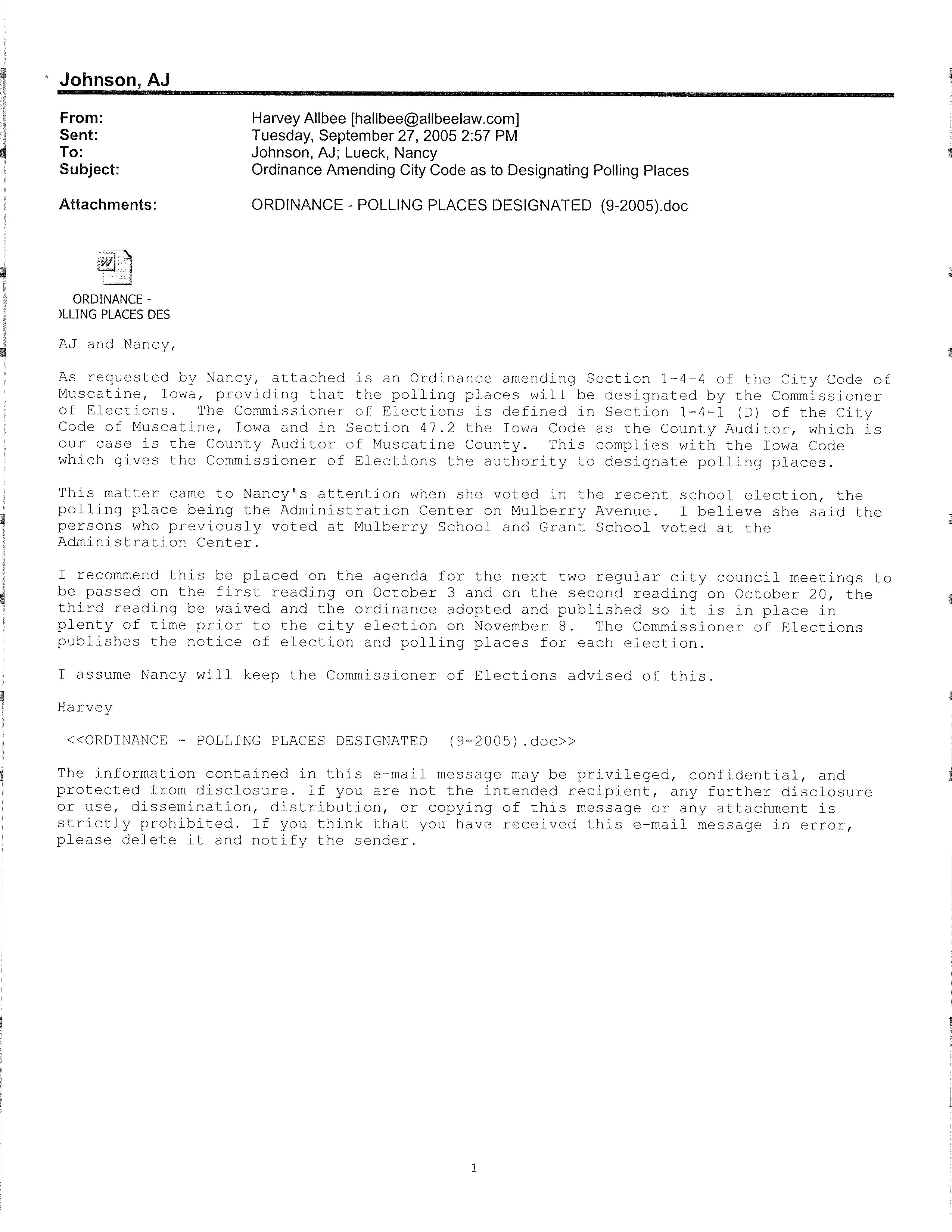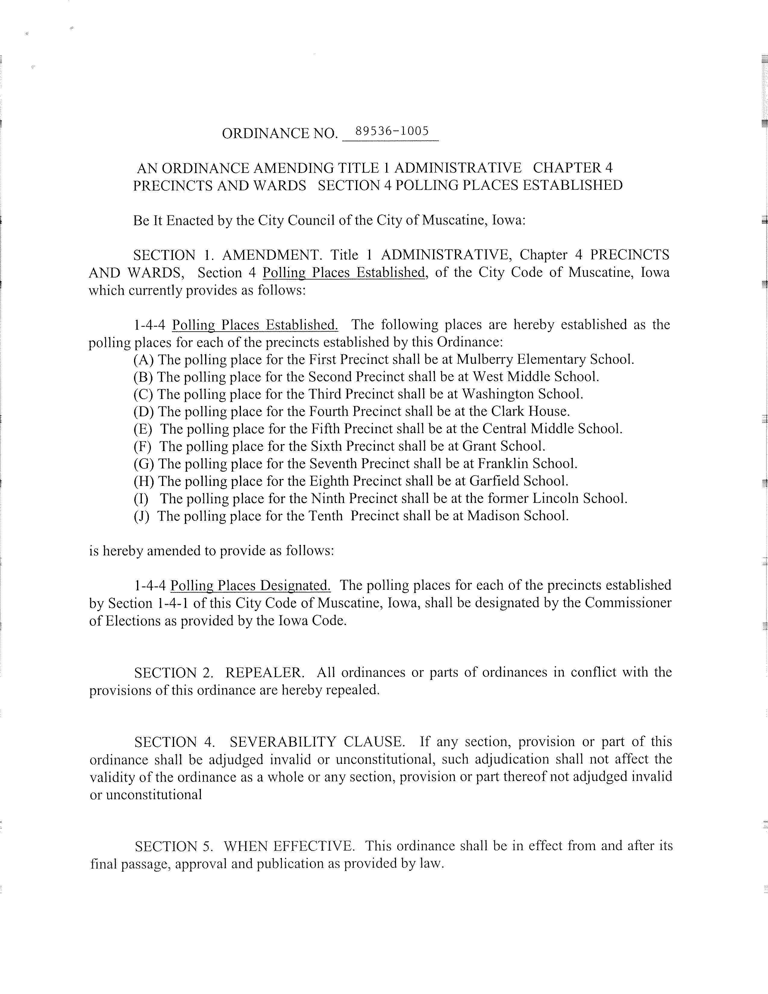 Version 1 Ord. Adopted Amending Title 1, Administration, Chapter 4, Precincts and Wards, and Section 4, Polling Places Established