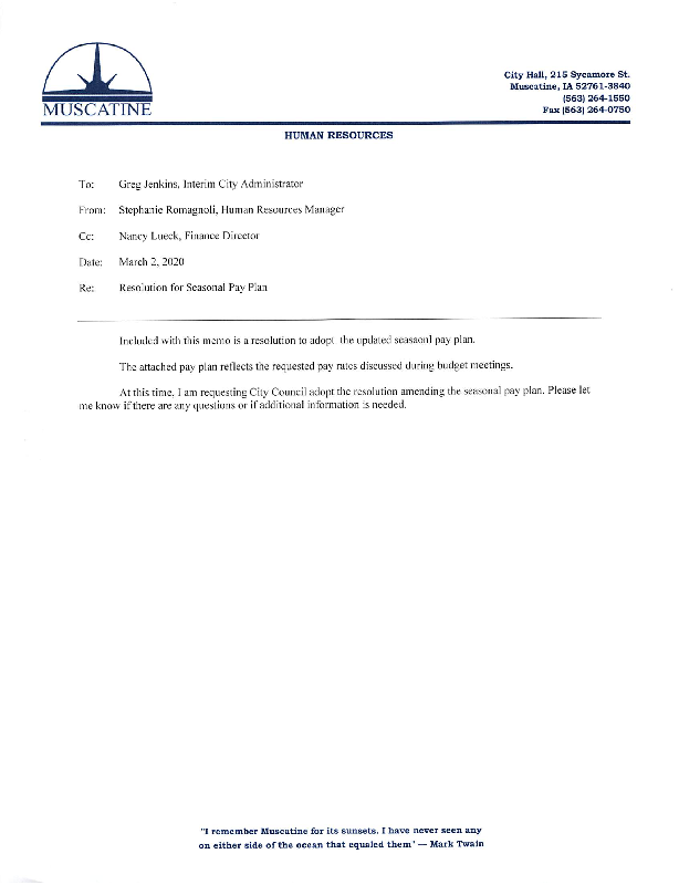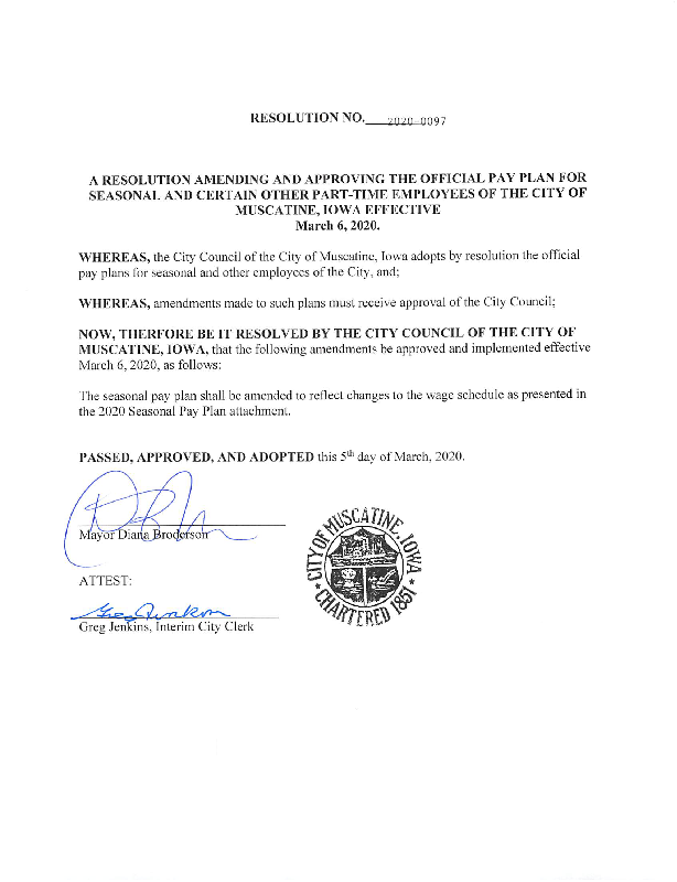 Version 1 RESOLUTION AMENDING AND APPROVING THE OFFICIAL PAY PLAN FOR SEASONAL AND CERTAIN OTHER PART-TIME EMPLOYEES OF THE CITY OF MUSCATINE, IOWA EFFECTIVE March 6, 2020.