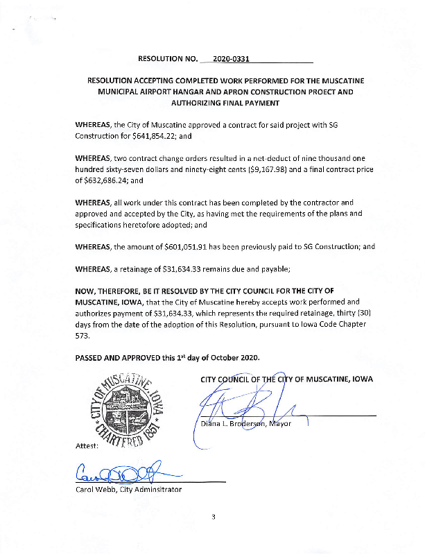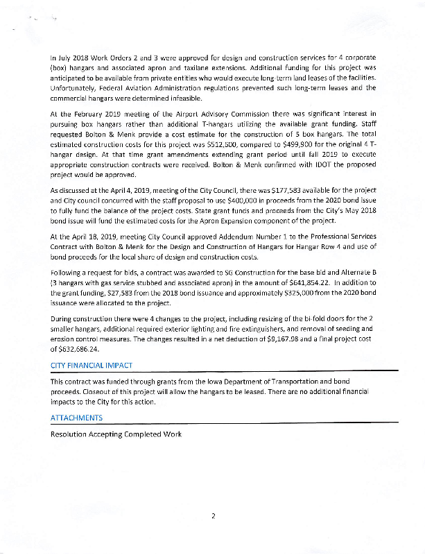Version 1 RESOLUTION ACCEPTING COMPLETED WORK - AIRPORT HANGAR AND APRON