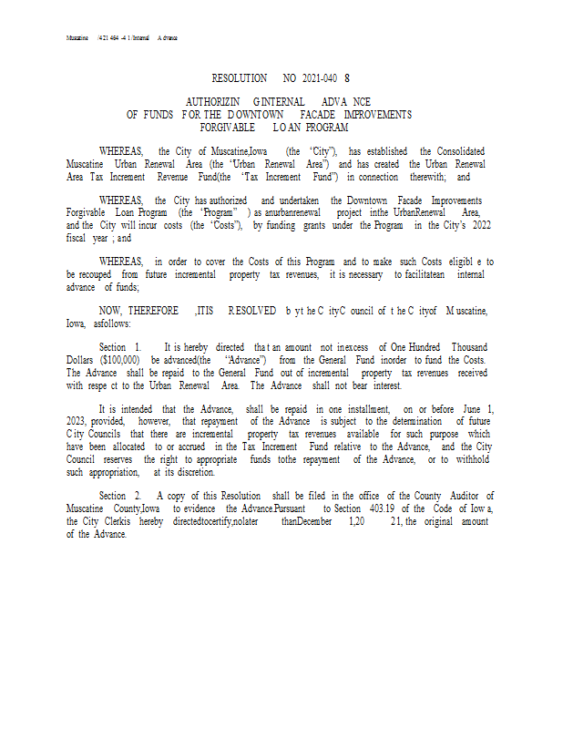 Version 1 Res Approving TIF Internal Advance Downtown FacadeFY 22 for FY 23 Budget.Res 11-4-21.pdf.pdf