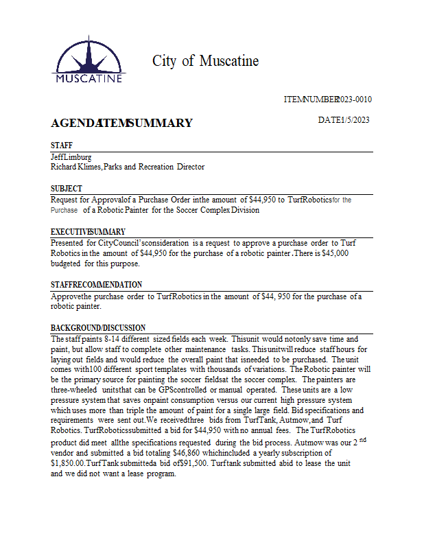 Version 1 2023-0010 Request for Approval of Purchase Order to Turf's Robatics for Robotic Painter for Soccer Complex.pdf
