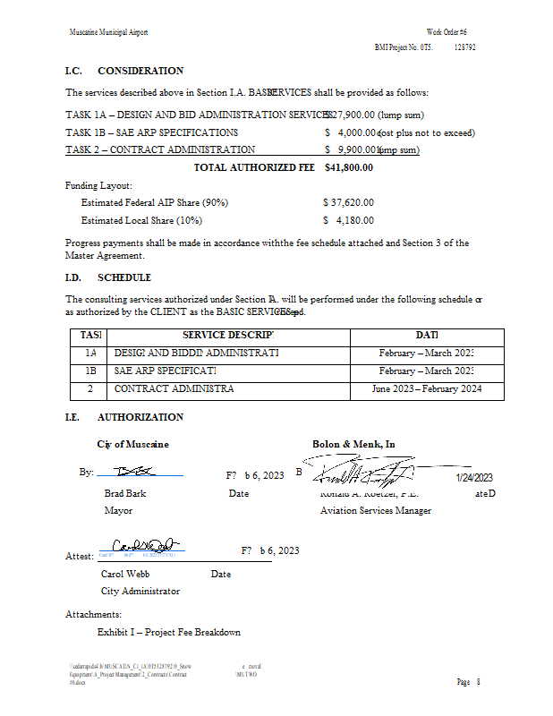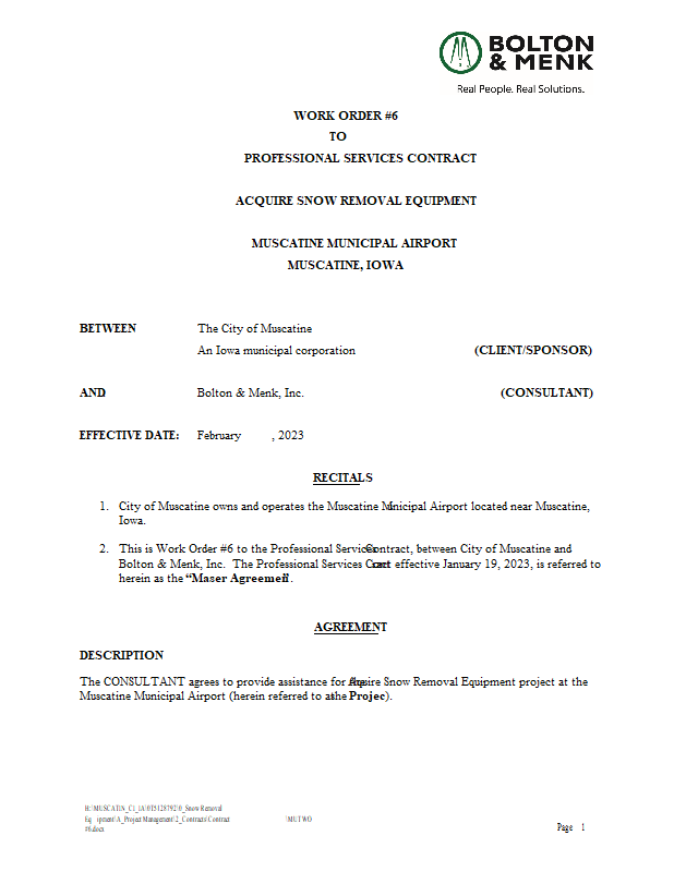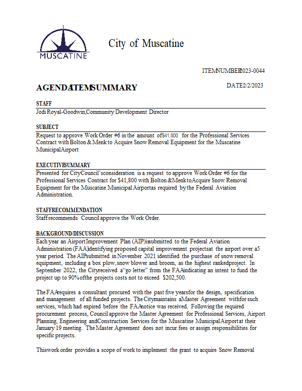 Version 1 2023-0044 Request to Approve Work Order 6 for Professional Services Agreement with Bolton & Men for Airport Snow Removal Equipment.pdf