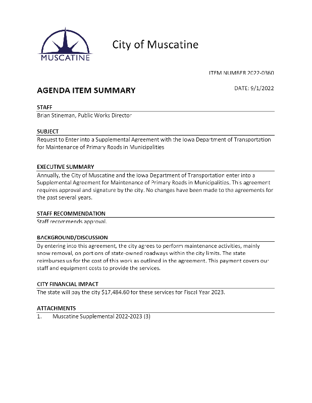 Version 1 2022-0360 Request to Enter into a Supplemental Agreement with the Iowa Dept of Transportation for Maintenance of Primary roads in Municipalities.pdf
