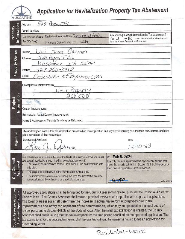 Version 1 2024-0019 Application for Revitalization Property Tax Abatement - 520 Aspen Trail.pdf