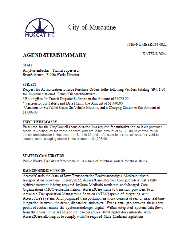 2024-0022 Request to Approve Issuance of Purchase Orders for Implementatin of Transit Dispatch Software.pdf
