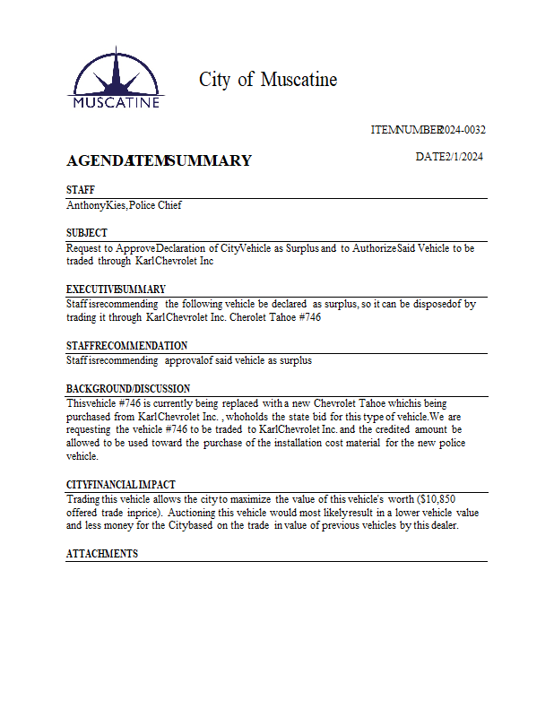 Version 1 2024-0032 Request to Declare Chevy Tahoe as Surplus and Trade in through Karl Chevrolet.pdf