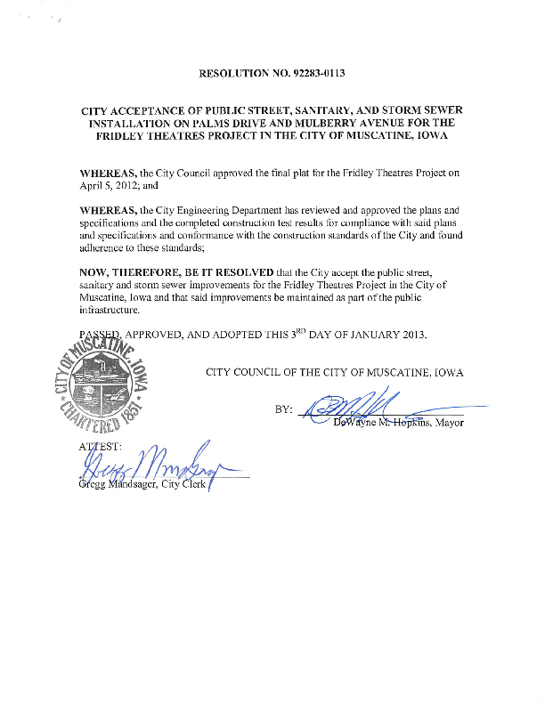 Version 1 92283-0113 Resolution Accepting Public Street and Storm Sewer Installation for Fridley Theater Project -.pdf