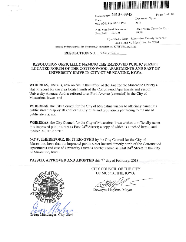 Version 1 92312-0213 Resolution Officially Naming the Improved Public Street Located North of the CottonWood Apartments and East of University Drive - Ford Avenue.pdf