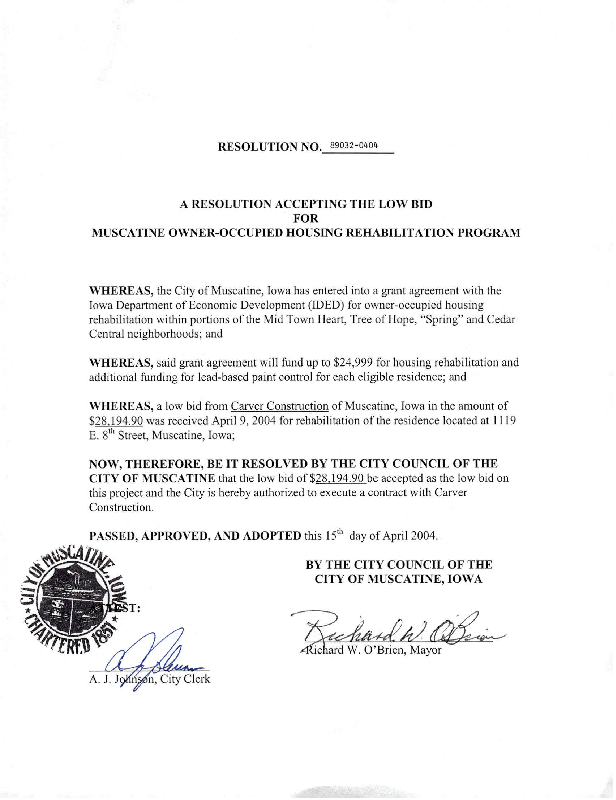 Version 1 Resolution Accepting The Low Bid for Muscatine Owner-Occupied Housing Rehabilitation Program - 1119 E. 8th Street.pdf