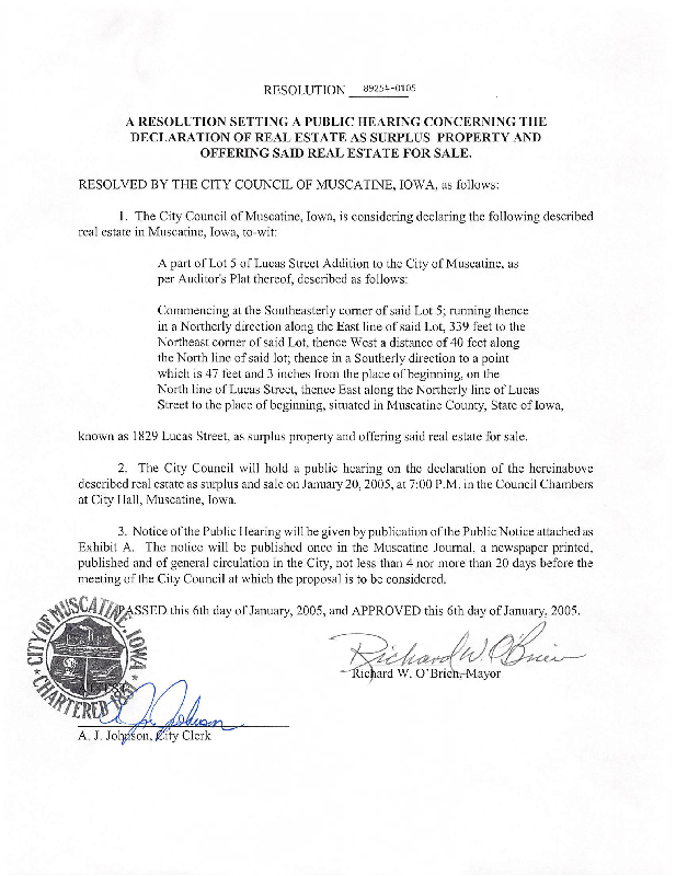 Version 1 Resolution Setting a Public Hearing Concerning the Declaration of Real Estate as Surplus - Lot 5 Lucas Street Addition.pdf