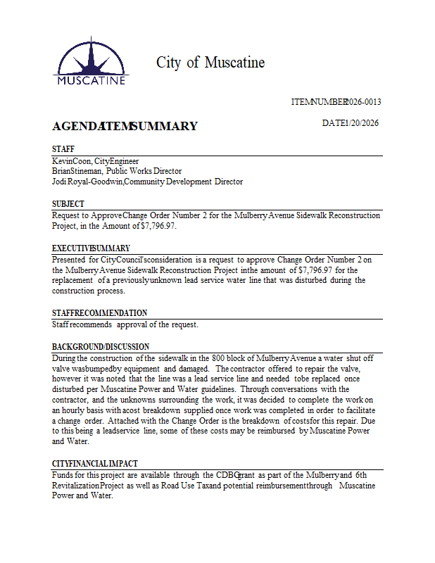 Version 1 2026-0013 Request to Approve Change Order Number 2 for the Mulberry Avenue Sidewalk Reconstruction Project, in the Amount of $7,796.97..pdf
