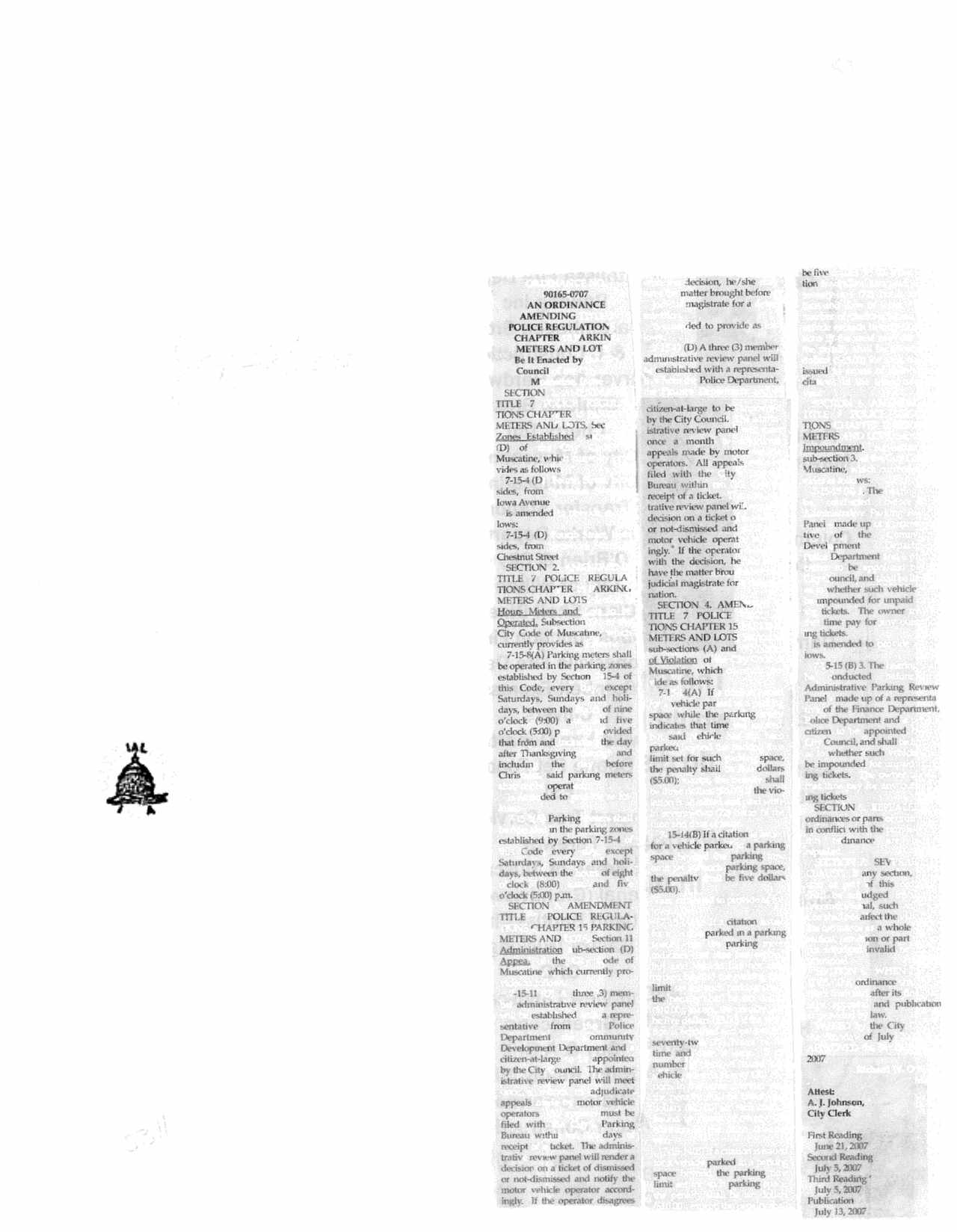 Version 1 Ord. Adopted Amending Title 7 Police Regulations, Chapter 15 Parking Meters and Lots