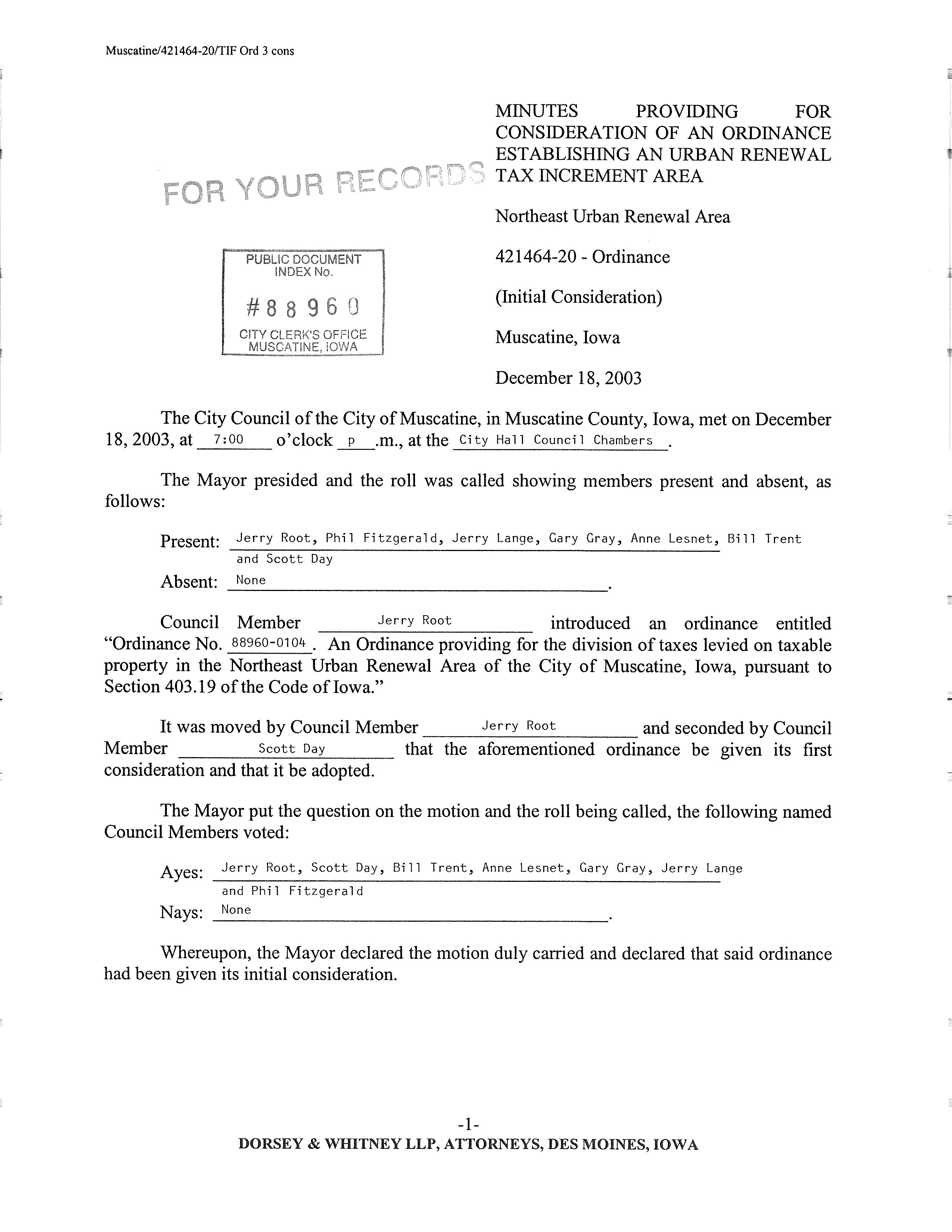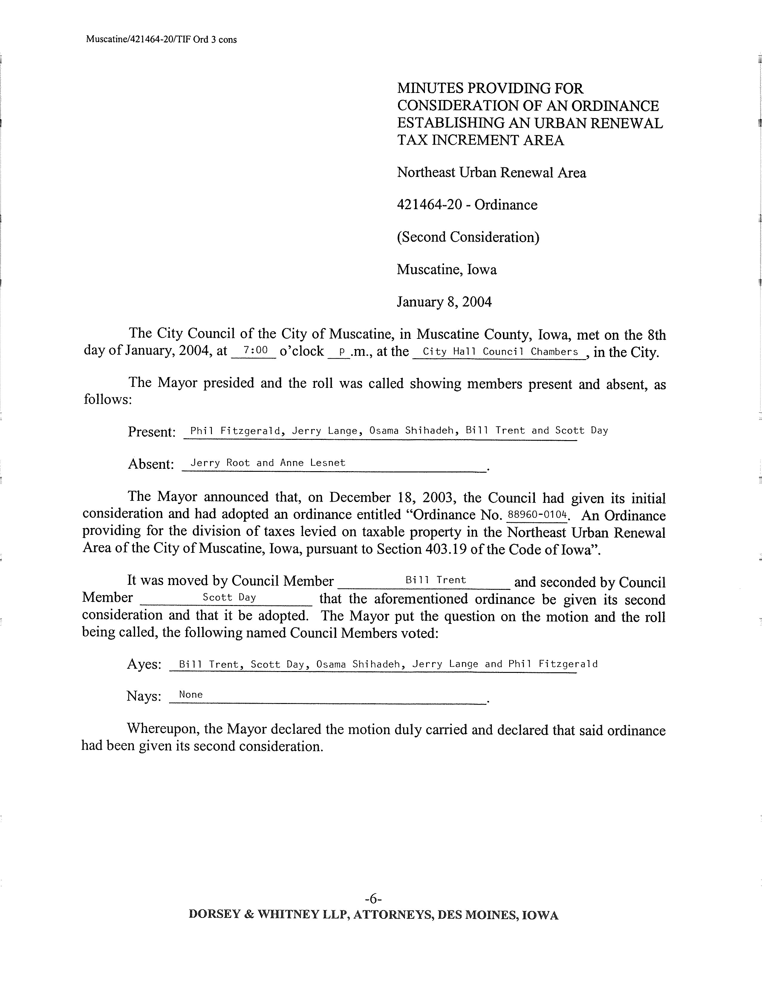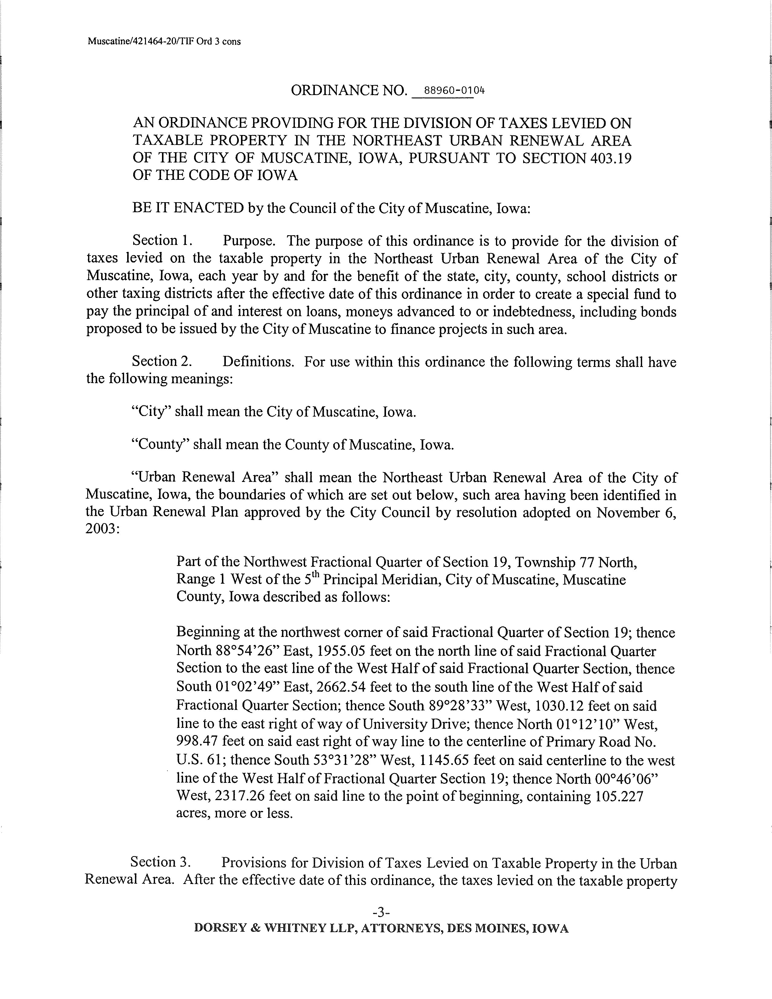 Version 1 Ordinance Approved on the Final Reading Establishing a TIF District in the Northeast Urban Renewal Area of the City of Muscatine