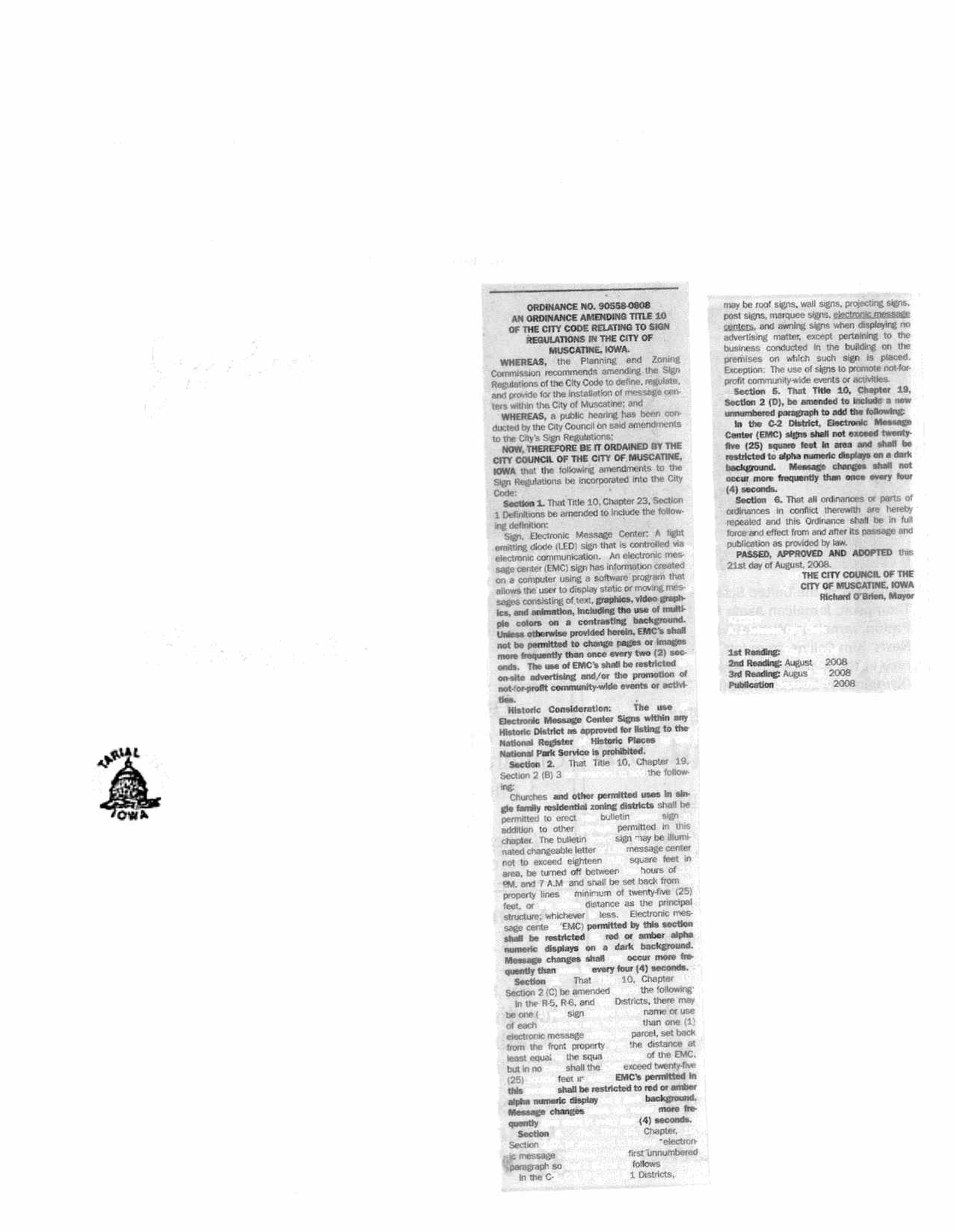 Version 1 Ord. Adopted Amending Title 10 of the City Code Pertaining to Sign Regulations in the City of Muscatine