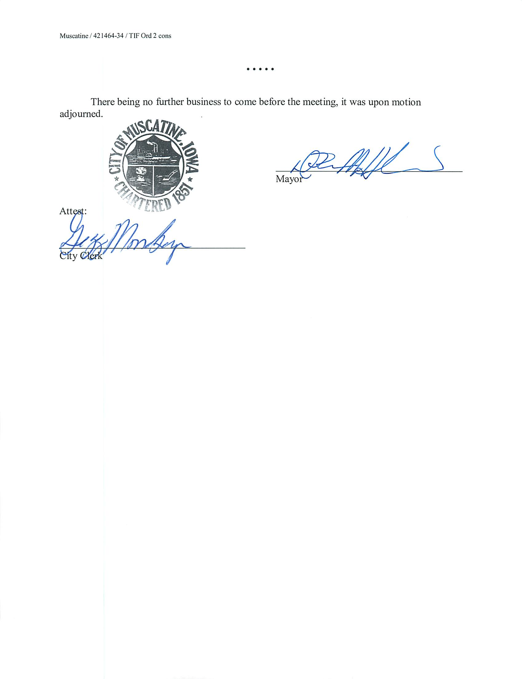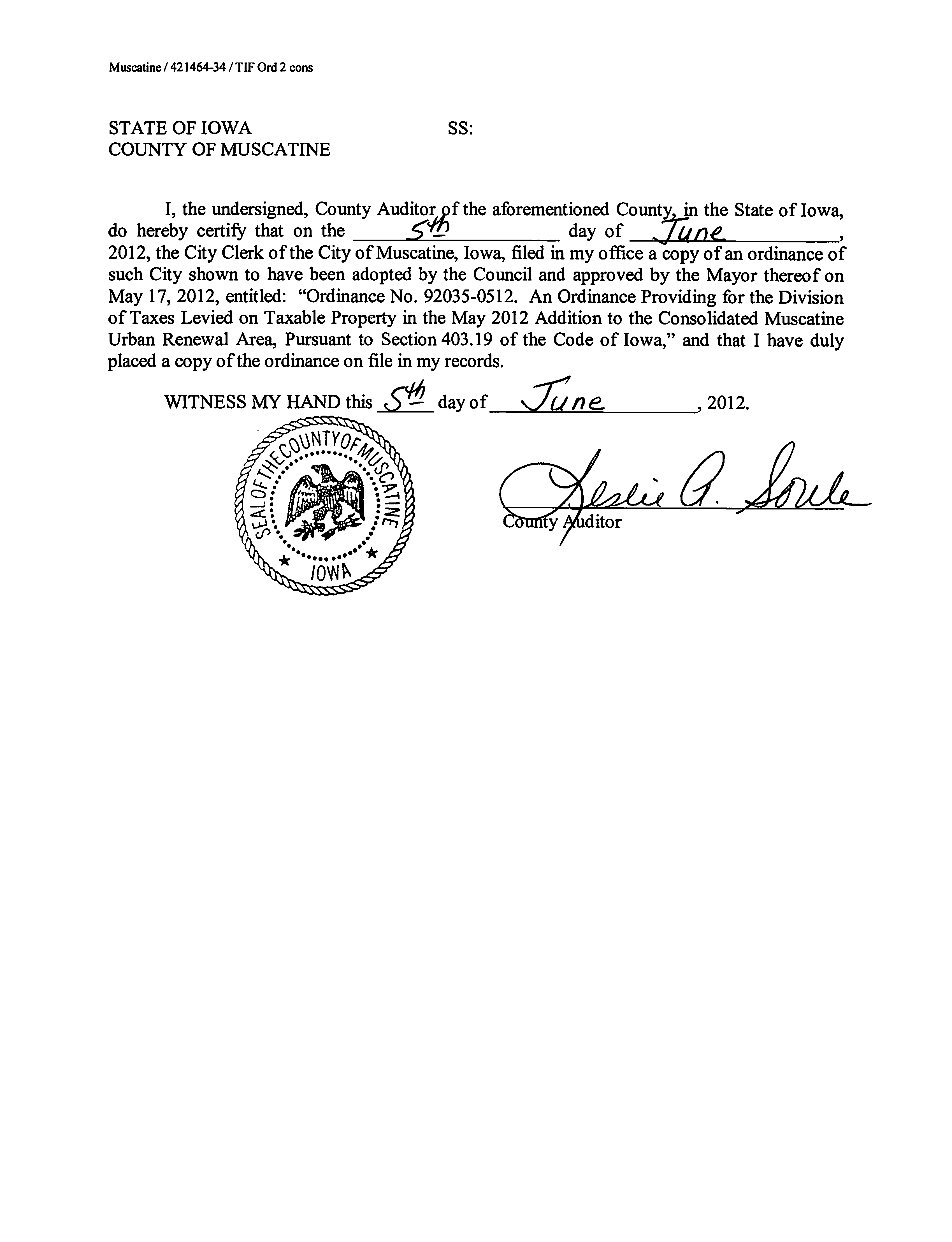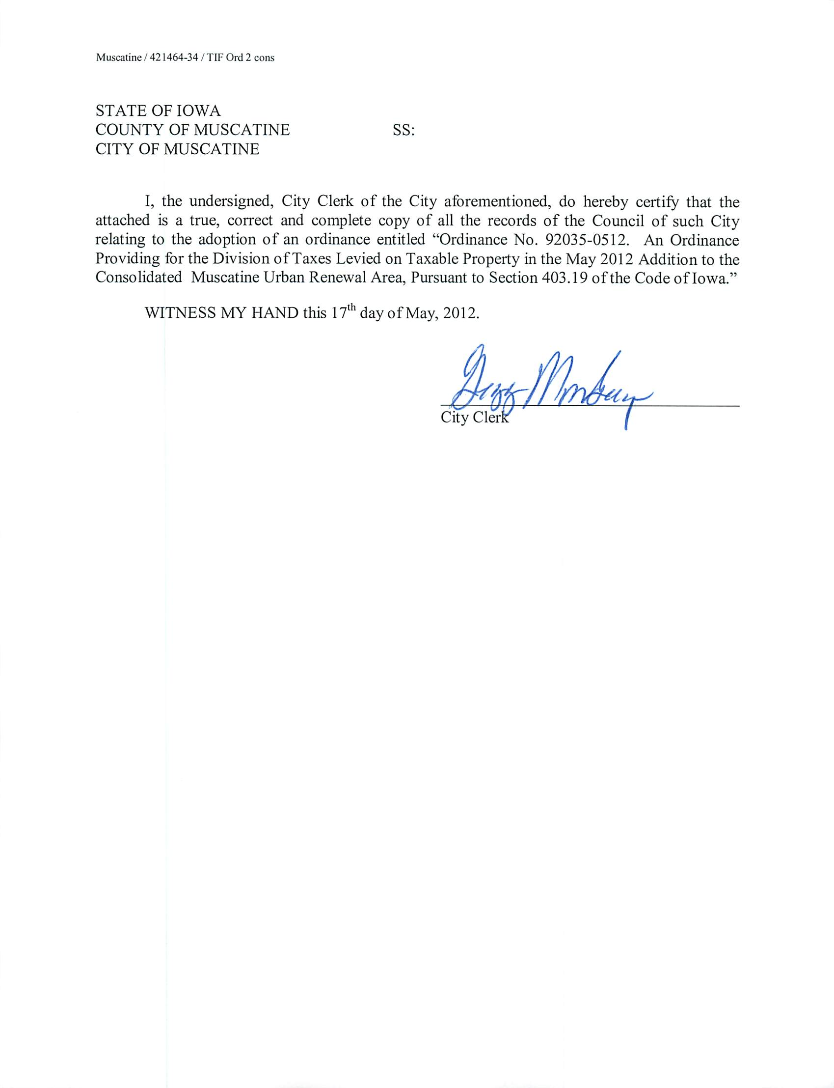 Version 1 Ord. Adopted Providing for Division of Taxes Levied on Taxable Property in the May 2012 Addition to the Consolidated Muscatine Urban Renewal Area