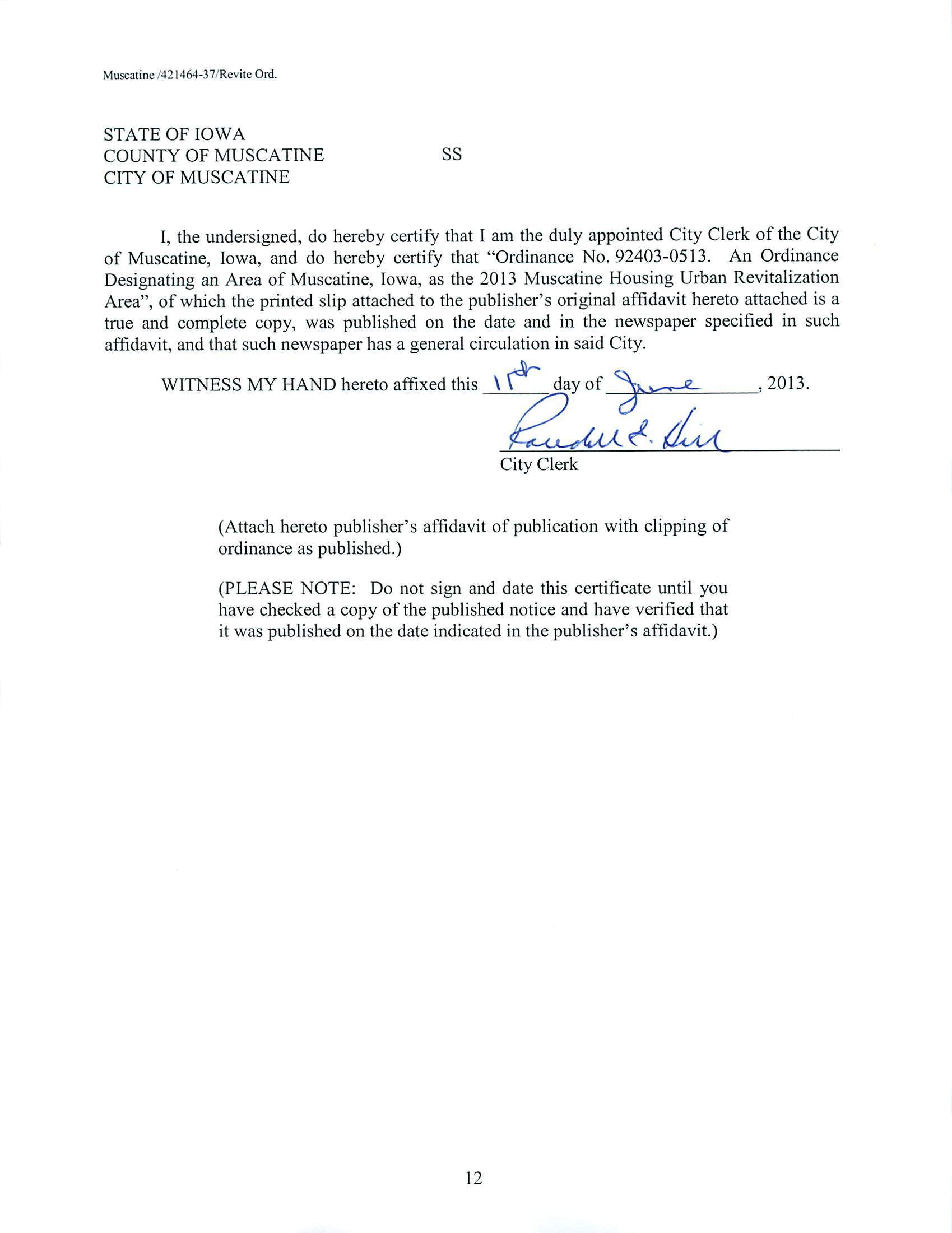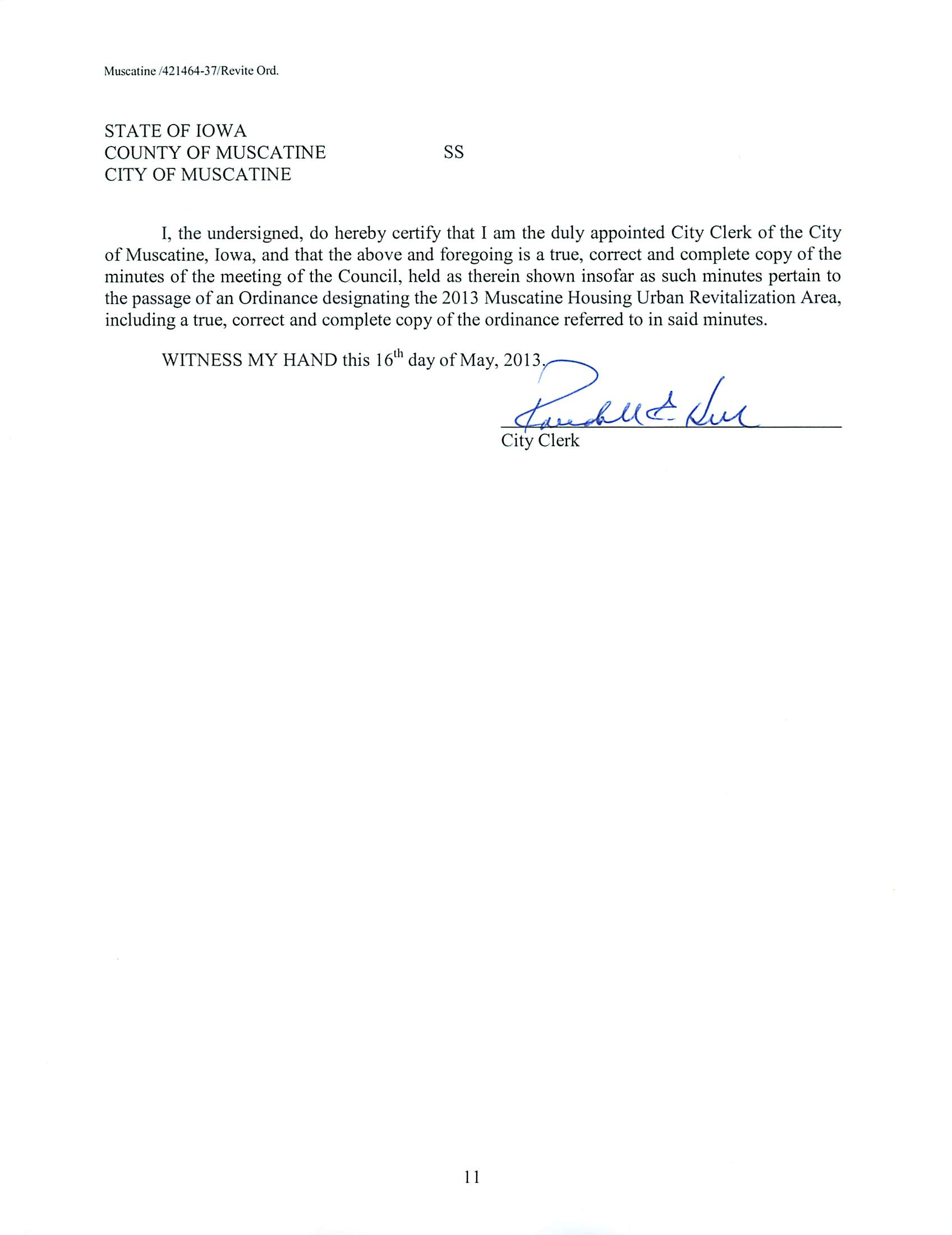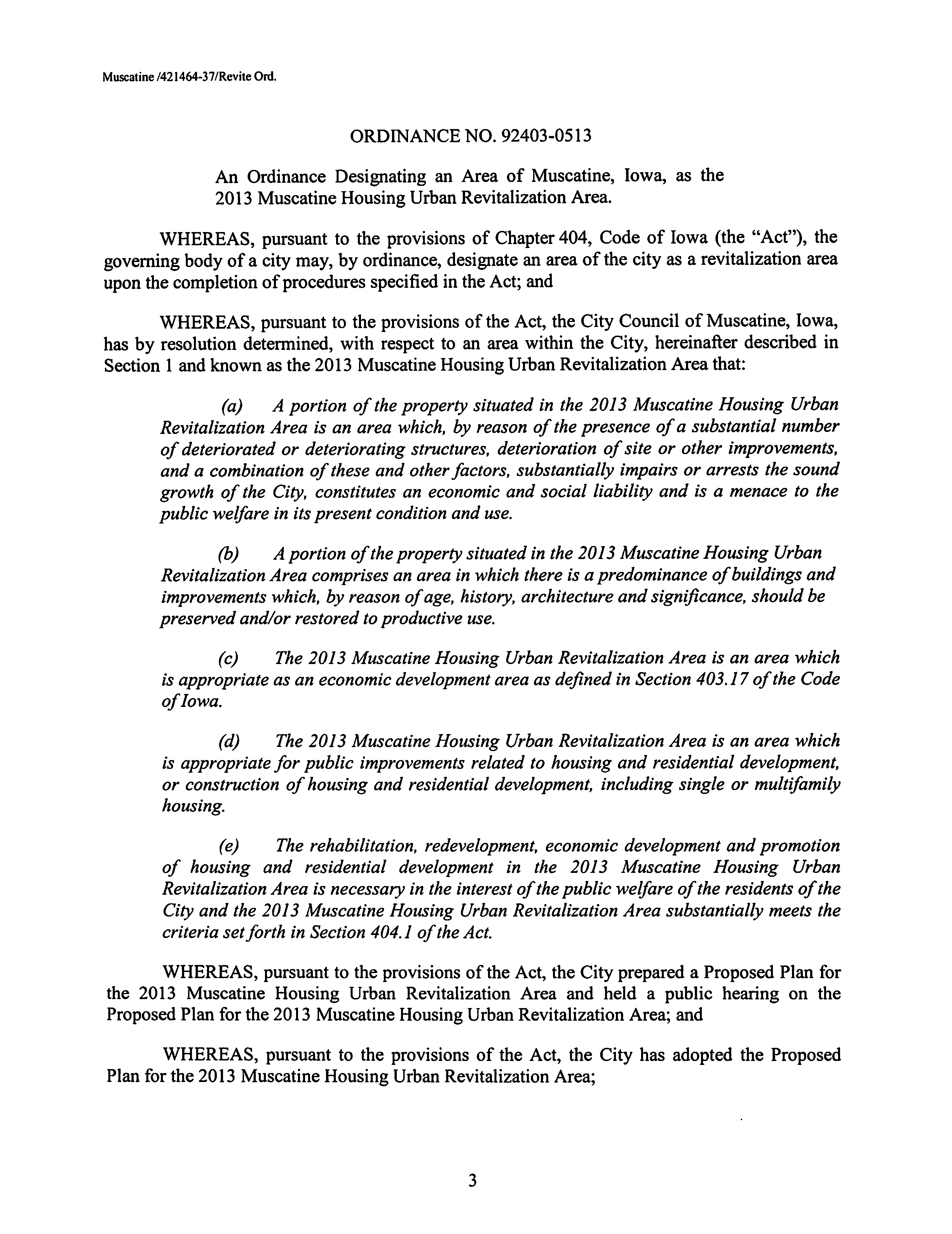 Version 1 Ord. Adopted Designating an Area of Muscatine as the 2013 Muscatine Housing Urban Revitalization Area