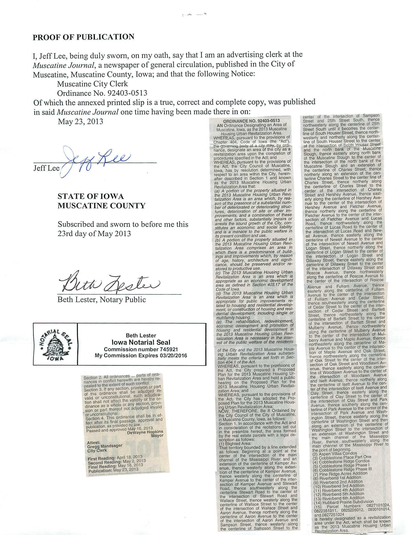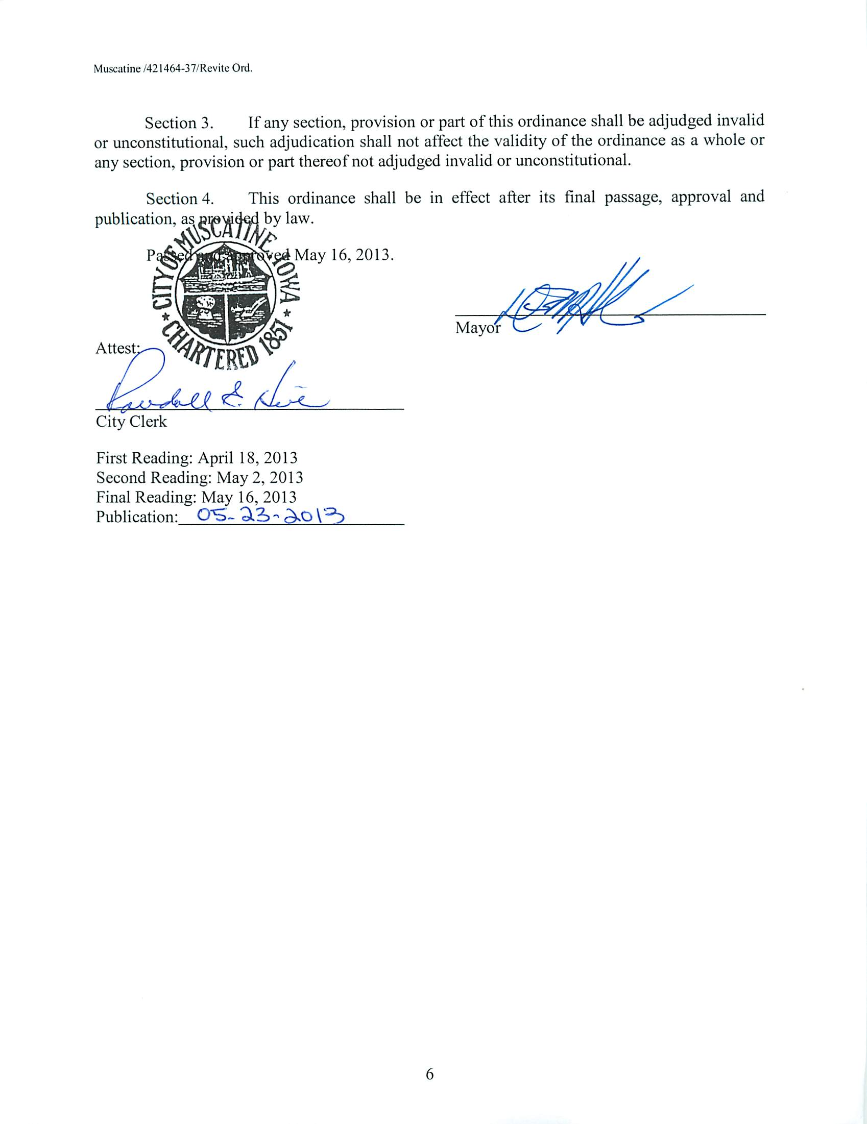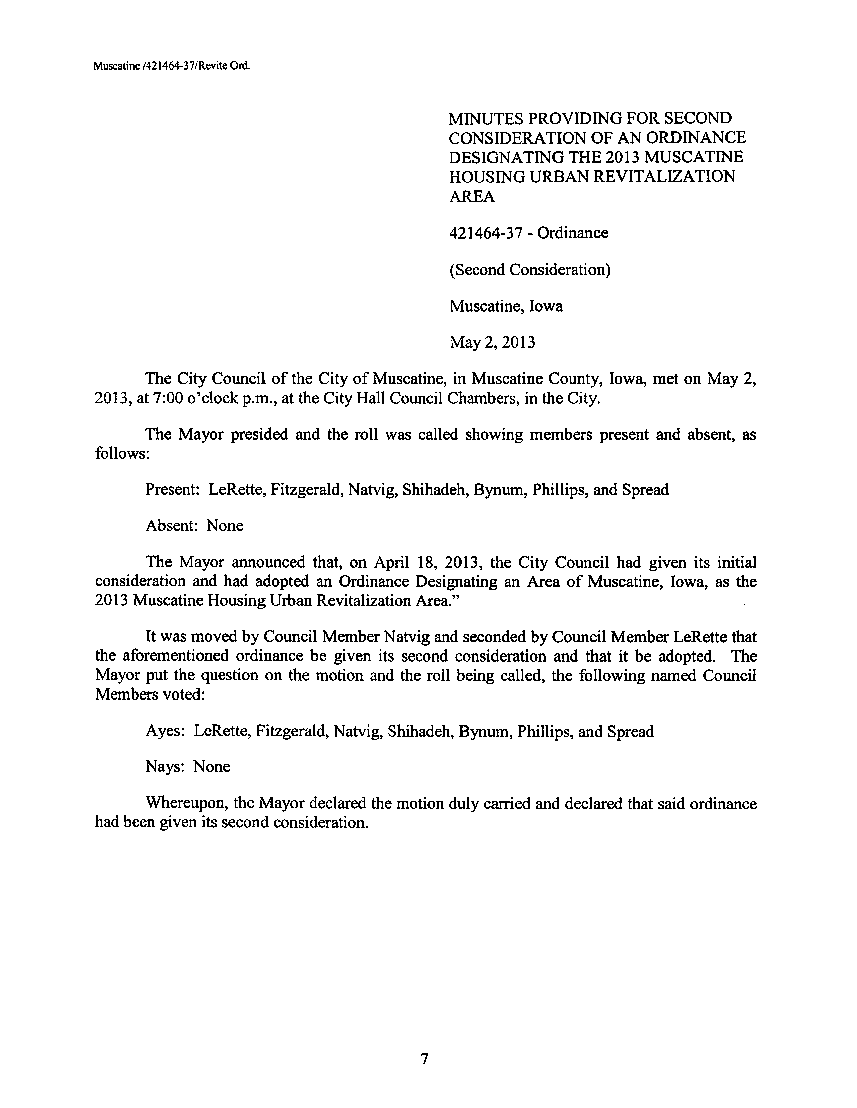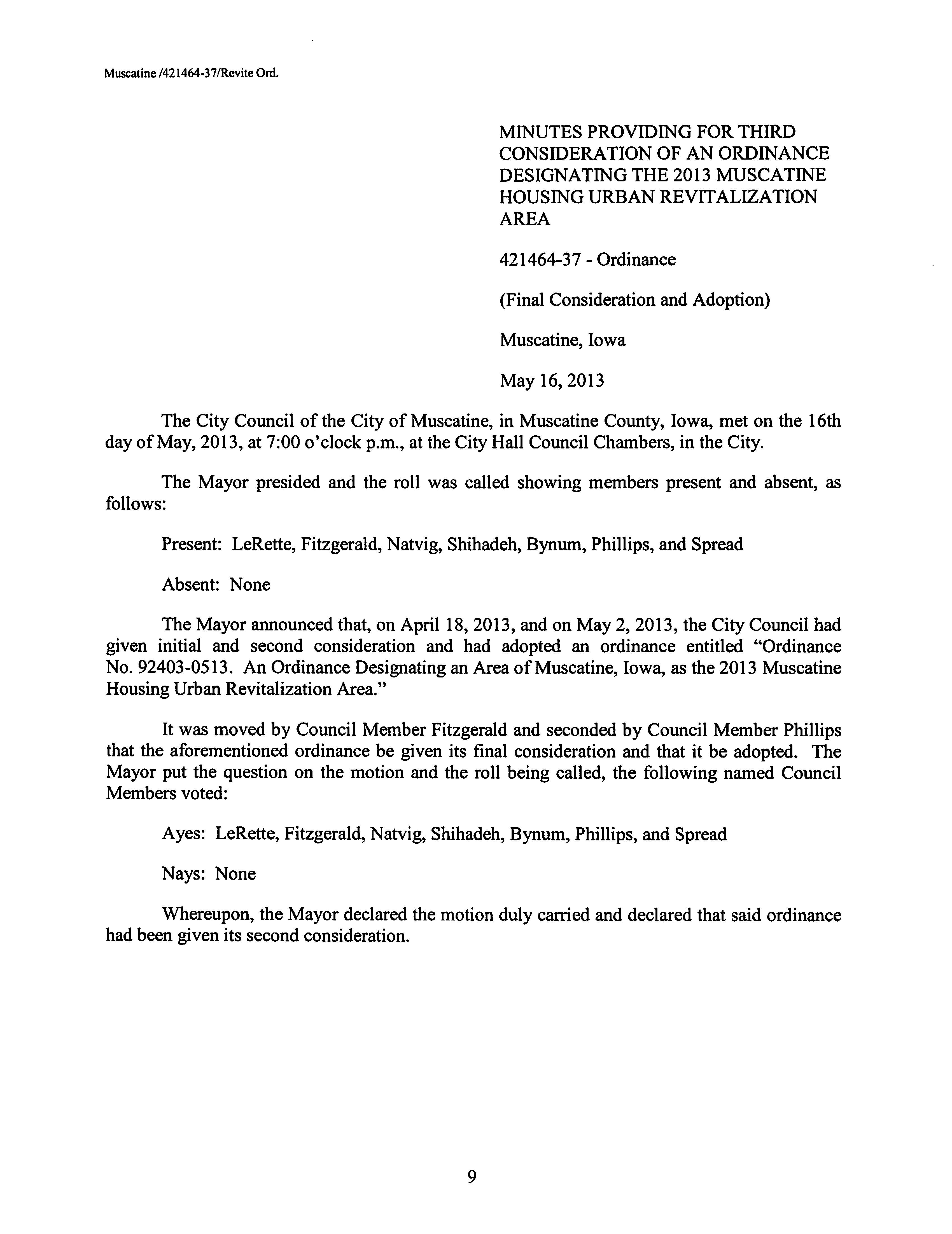 Version 1 Ord. Adopted Designating an Area of Muscatine as the 2013 Muscatine Housing Urban Revitalization Area