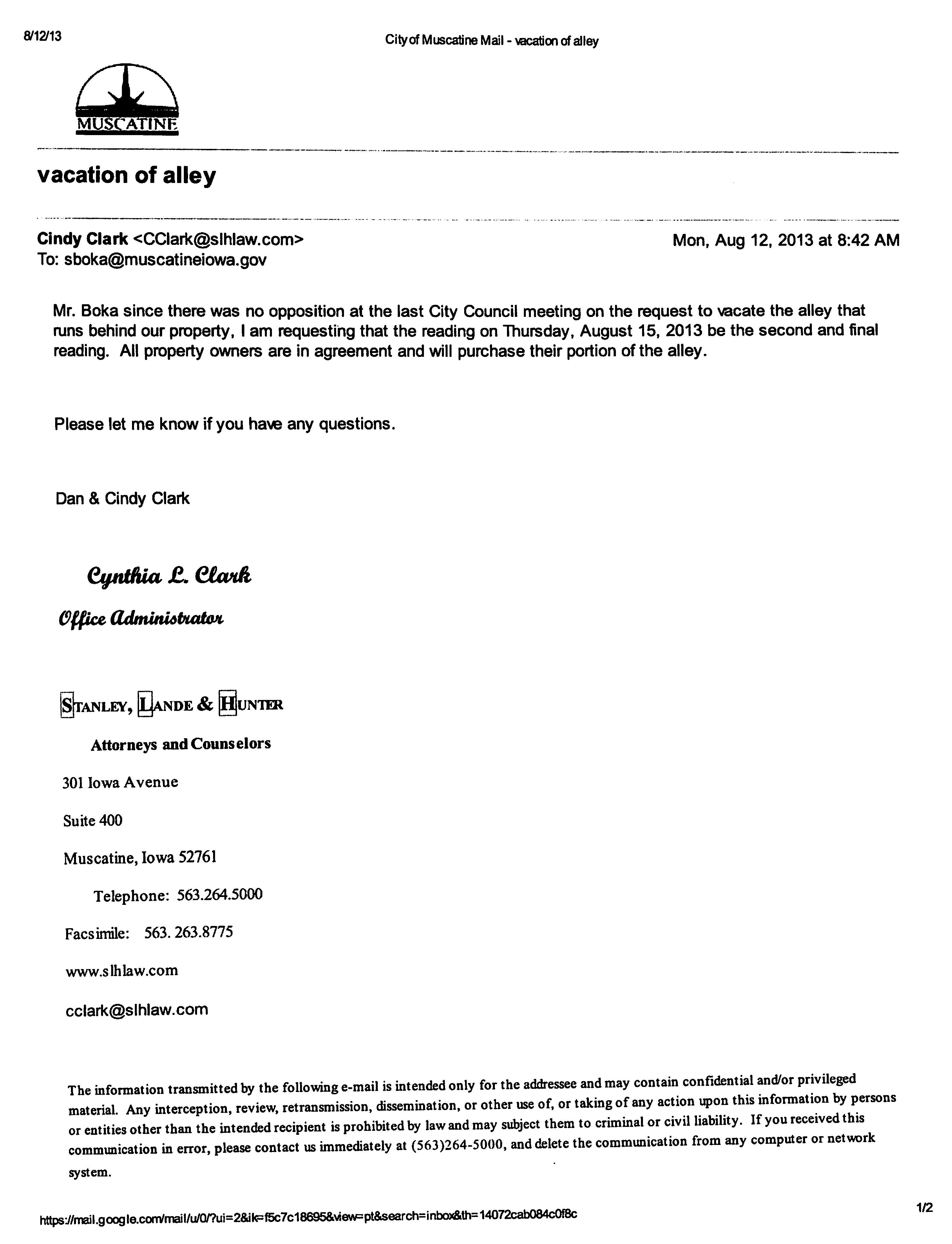 Version 1 Ord. Adopted Vacating Certain Rights-of-Way in the City of Muscatine - Burnside Avenue