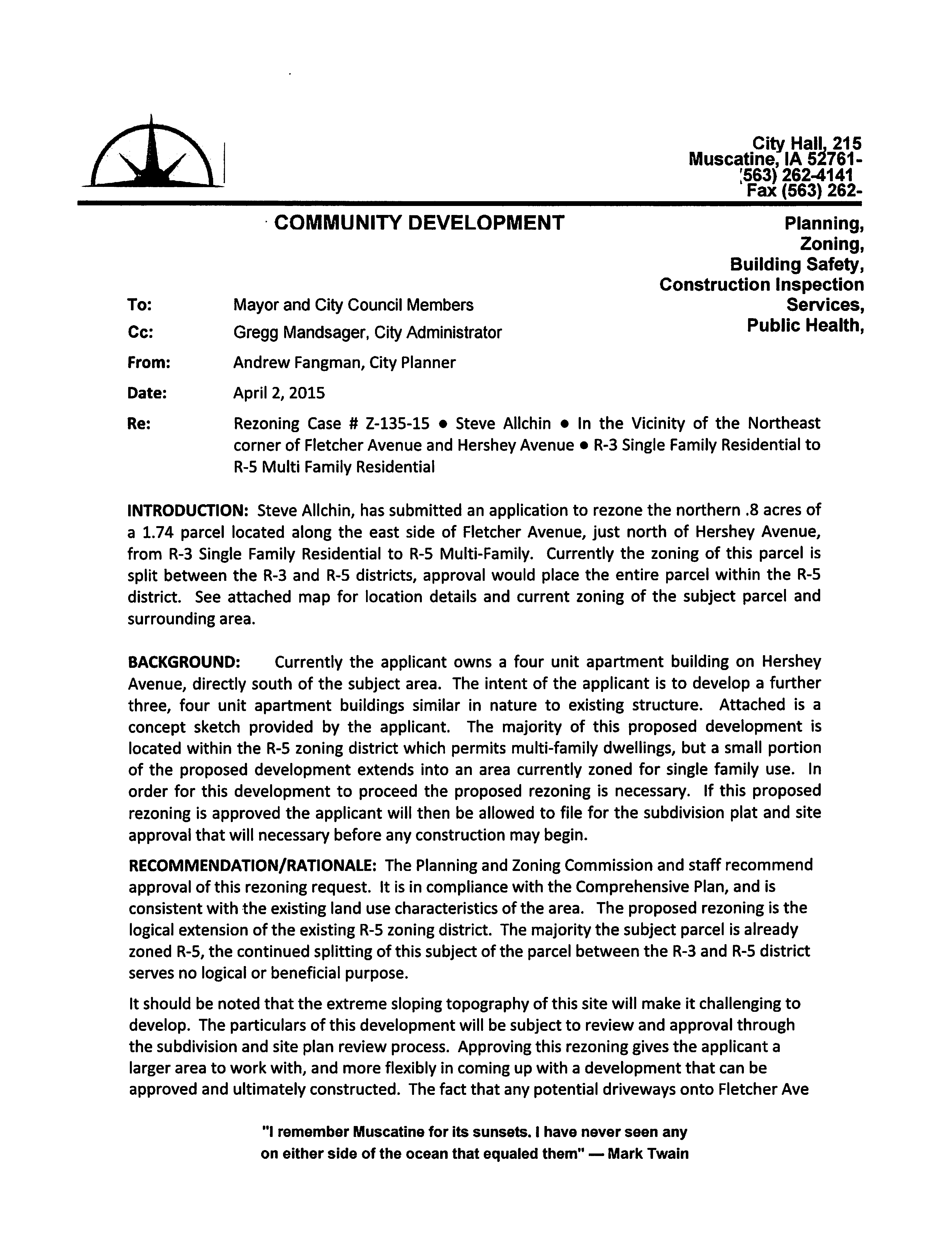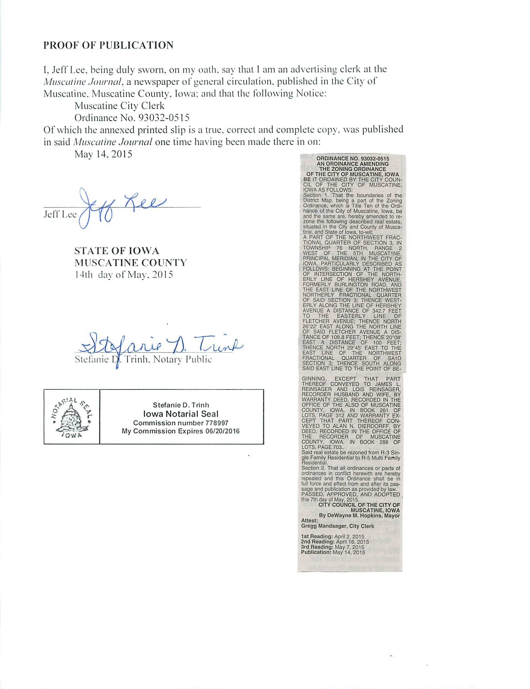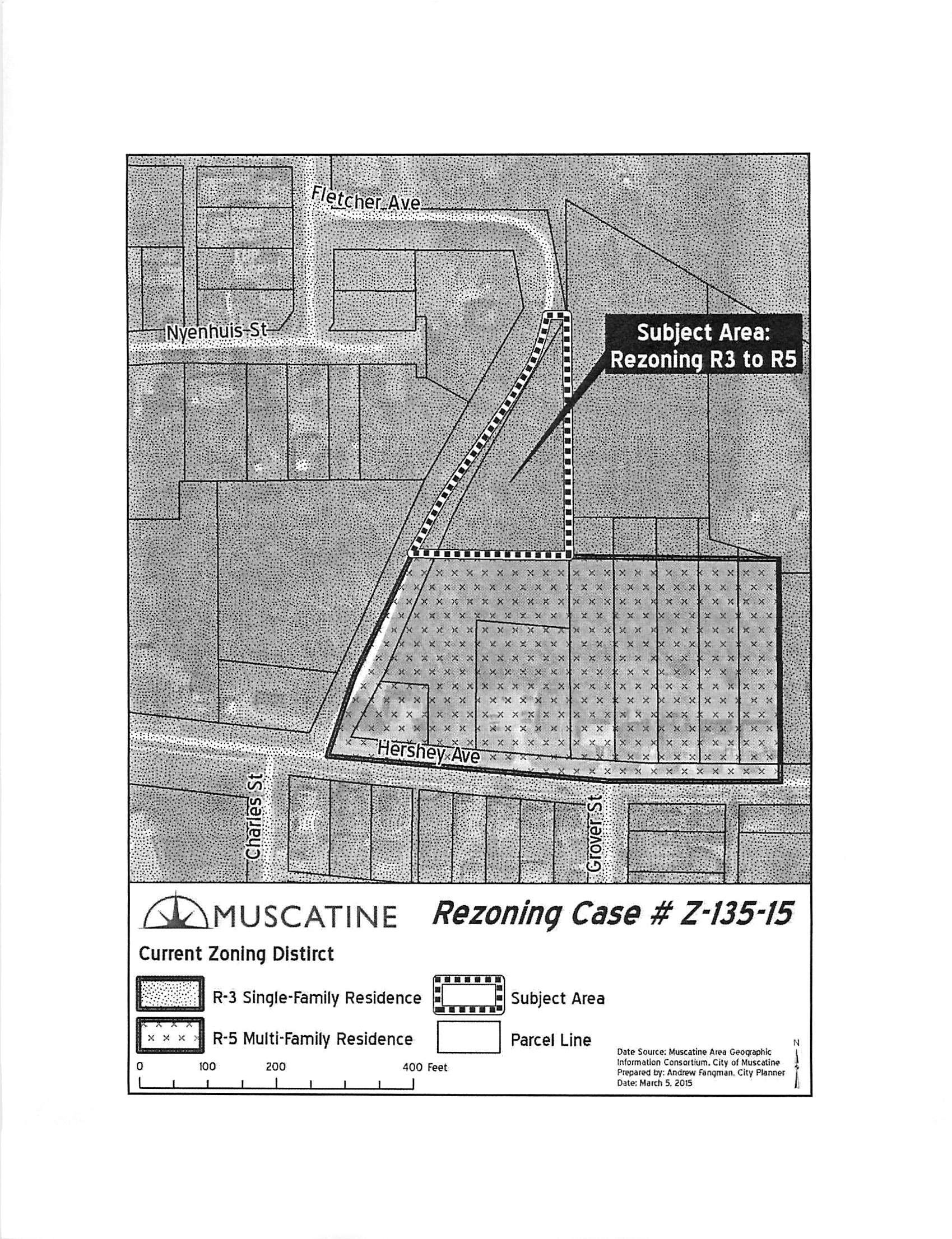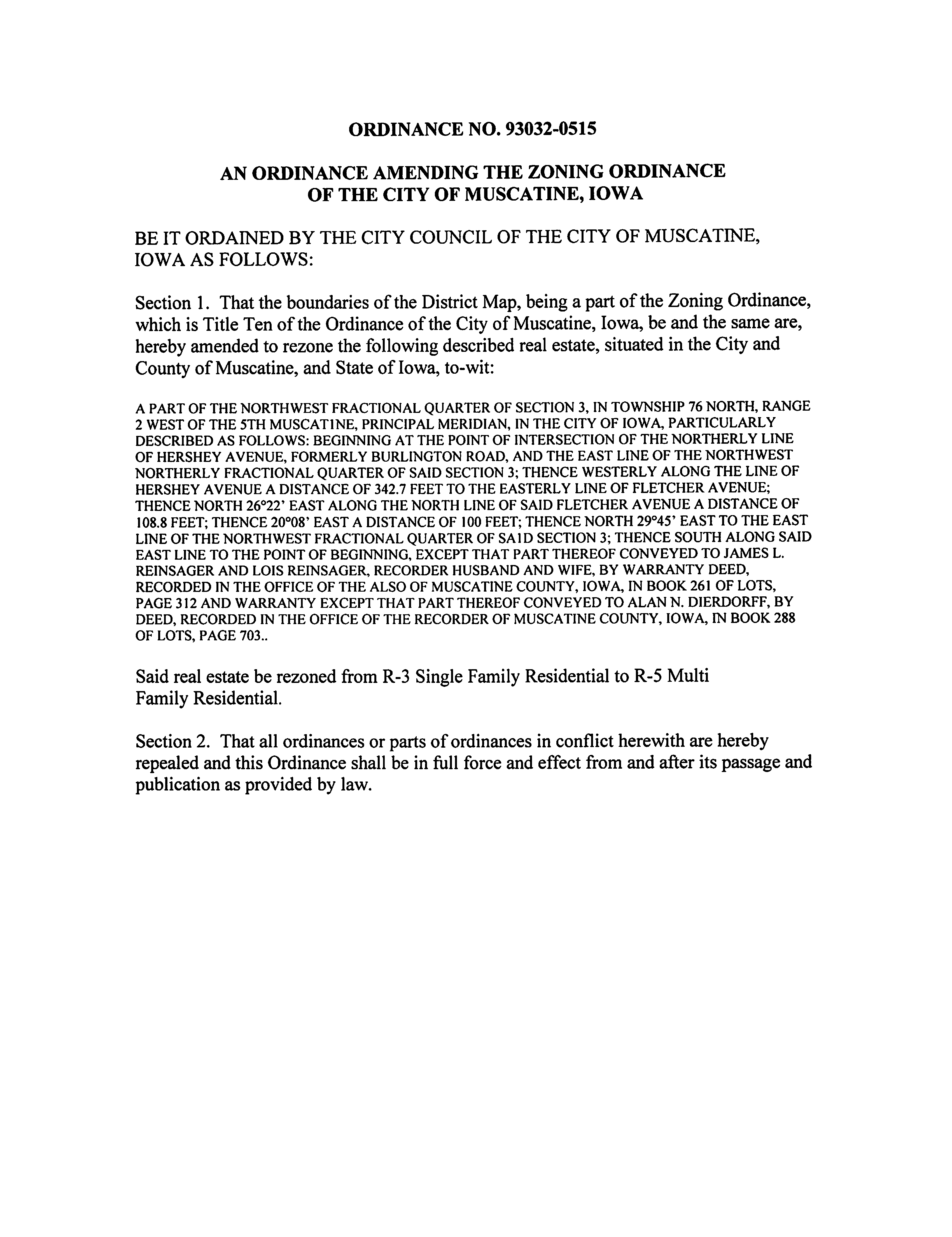 Version 1 Ord. Adopted Amending Zoning Ordinance of the City of Muscatine from R-3 Single Family Residential to R-5 Multi Family Residential - Fletcher Avenue